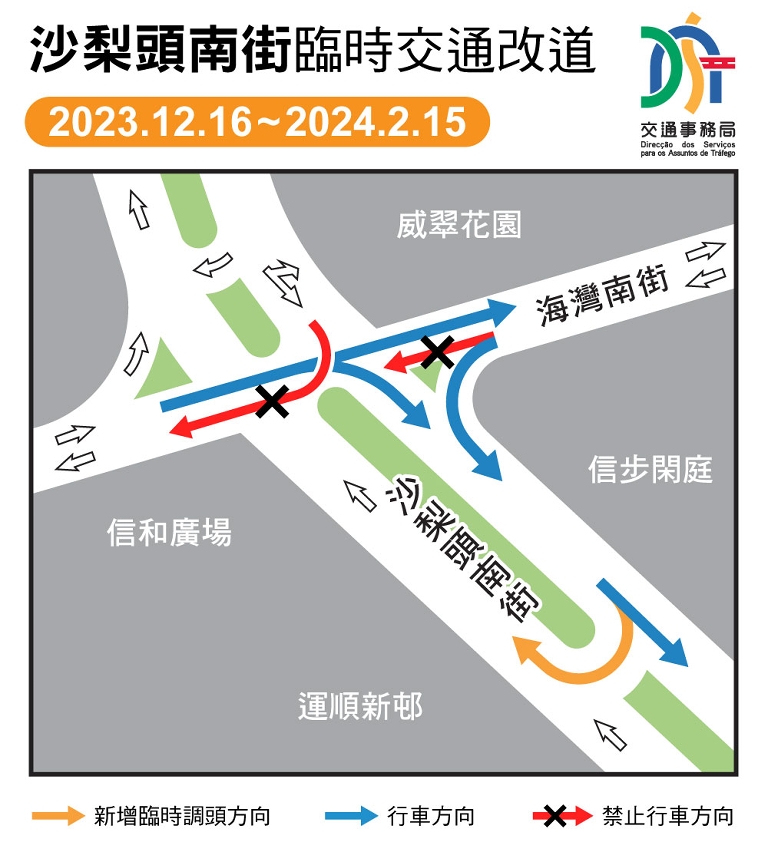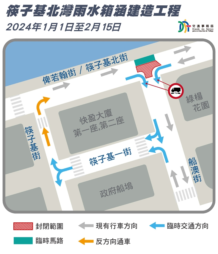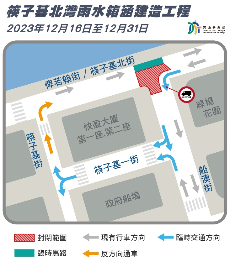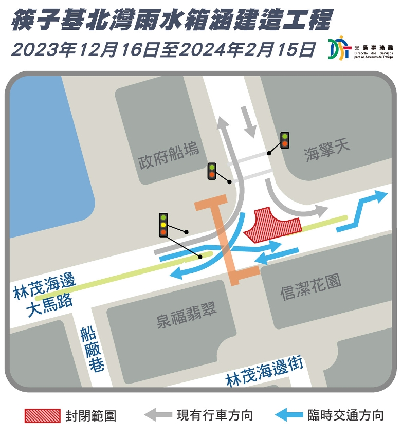 市政署正有序推展筷子基北湾泵站箱涵渠工程,在接续的阶段,即由12月16日起,俾若翰街与船澳街交界,以及林茂海边大马路与船澳街交界将会同步施工,届时相关路段将实施多项临时交通措施,交通事务局亦于沙梨头南街新增临时掉头车行道,以更好地疏导周边道路的车流,有关临时交通安排可参阅附表。