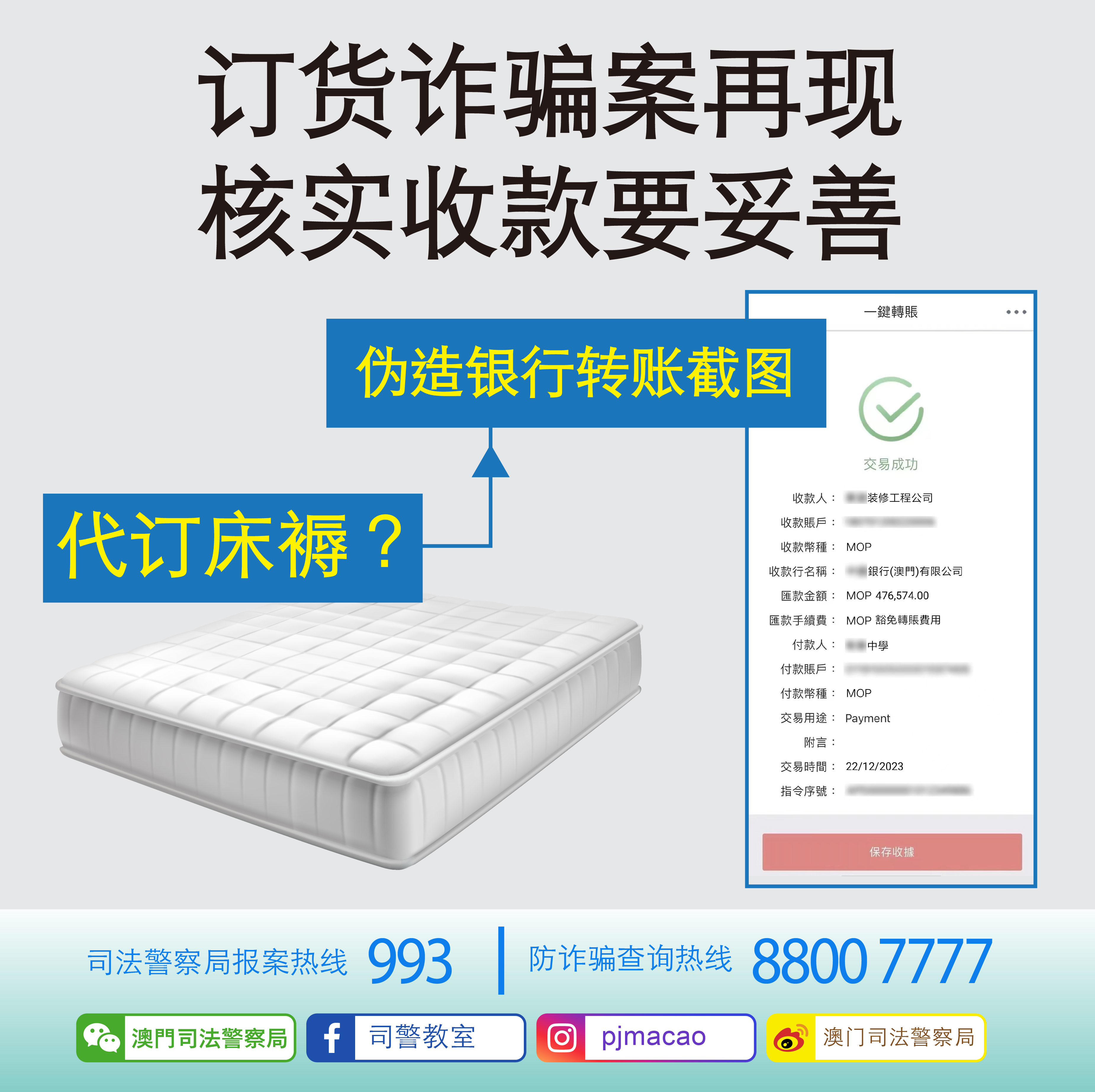 3.怀疑遇骗,请即致电司警局防诈骗查询热线8800 7777或报案热线993。
