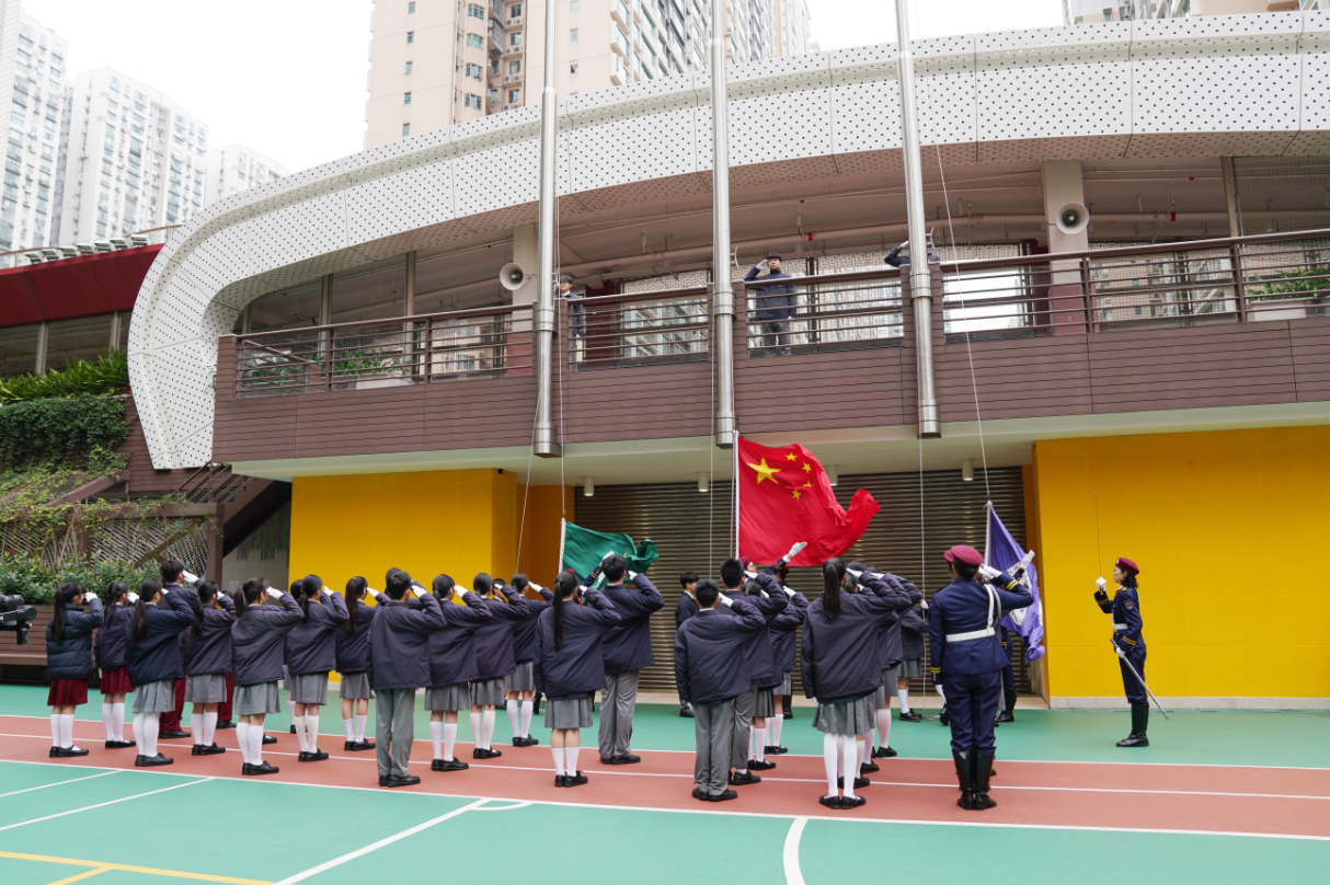 澳门大学附属应用学校校长卢兰馨和多名师生出席活动。澳大国旗仪仗队的骨干成员和澳大附校升旗队队员首先采用联合升旗模式,在该校操场以铿锵有力的步伐、整齐划一的动作完成升旗。