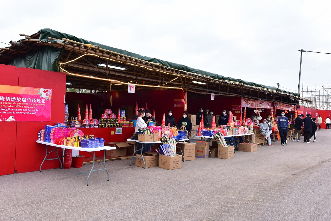 两个燃放区内各设有四个售卖爆竹、烟花、火箭的摊檔,开放时间为二月九日(年三十)中午十二时至翌日凌晨一时、二月十日(年初一)至十四日(年初五)每日上午十时至晚上十二时。