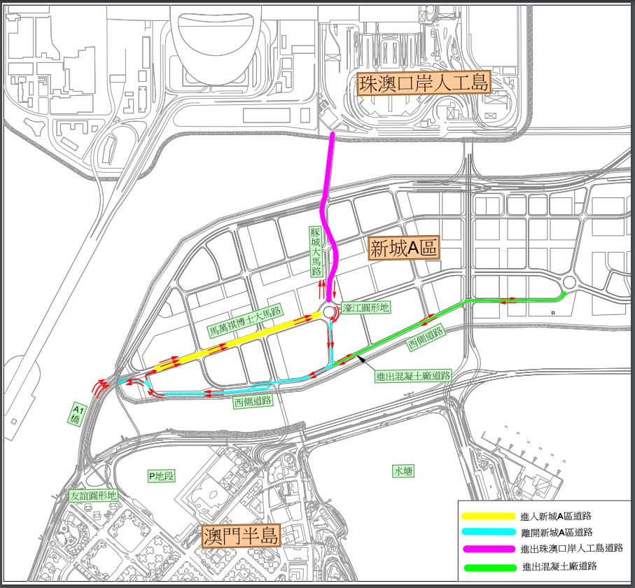 新城A区西侧道路将于2024年2月4日开通,届时由珠澳口岸人工岛经濠江圆形地进出新城A区及澳门半岛的车辆需使用西侧道路,而目前用作进出珠澳口岸人工岛及新城A区的马万祺博士大马路将改作单向行车(详见附图1),是次的交通通行措施主要是配合新城A区的规划及发展,同时为A区北区及中区下一阶段在马万祺博士大马路及豚城大马路进行共同管道及道路施工创造条件,请驾驶者留意现场交通指示及改道后的行车路线。