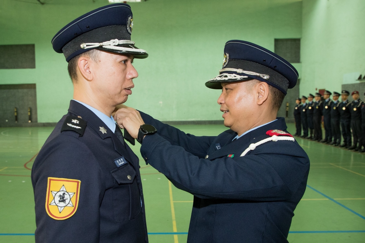 今(6)日上午,治安警察局在特警队大楼举行警长及副警长晋升仪式,仪式由吴锦华局长主持,黄伟鸿副局长、梁庆康副局长、伍素萍副局长及各部门主管出席仪式。仪式上,各位晋升的警长和副警长正式戴上新的肩章,标志着晋升人员肩负起更多的职责。