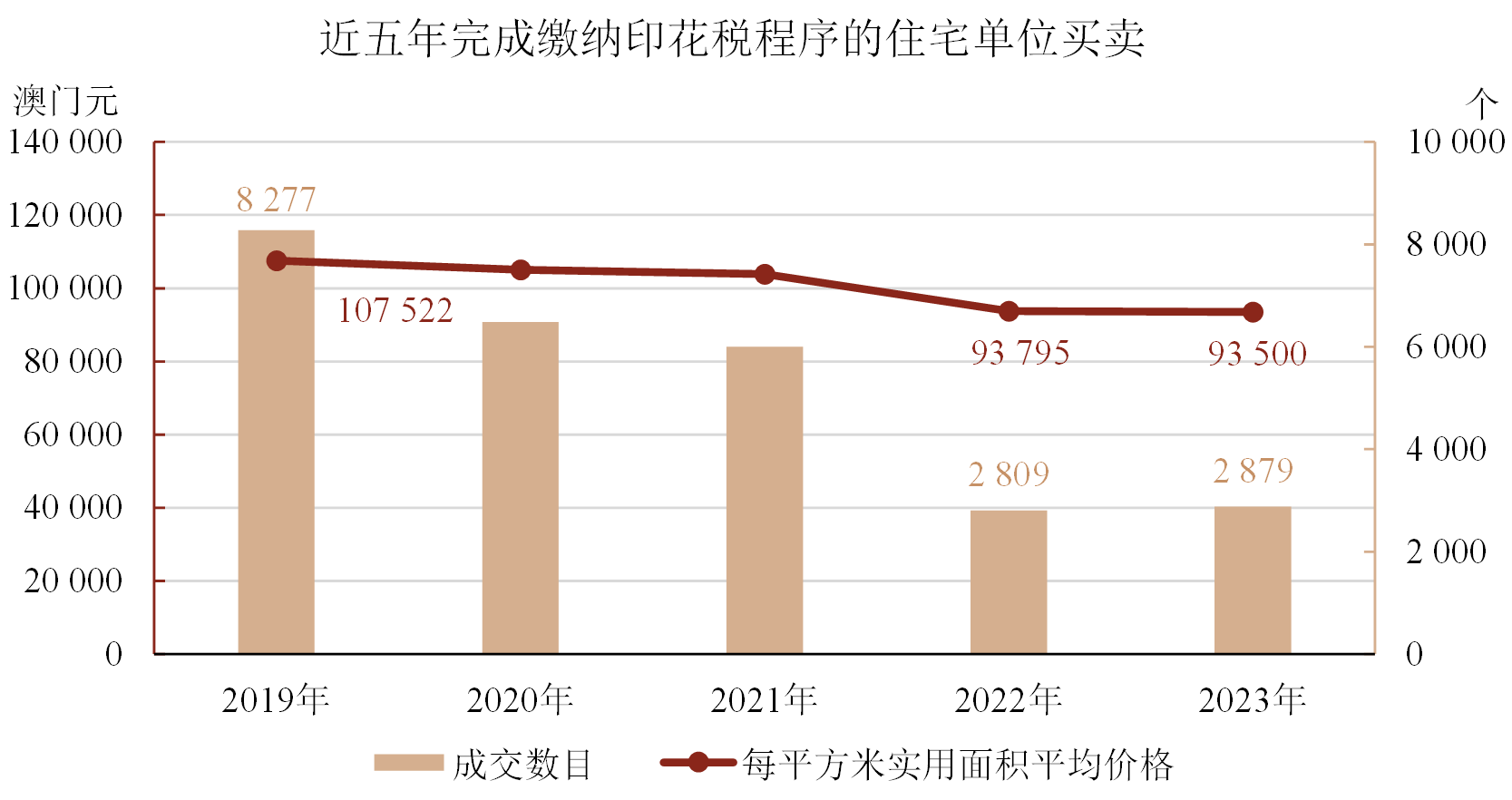 统计暨普查局资料显示,2023年全年完成缴纳印花税程序的楼宇单位及停车位买卖共4,416个,按年减少2.8%,成交金额下跌5.9%至232.3亿元(澳门元,下同)。住宅单位买卖有2,879个,按年增加70个,总值183.0亿元,上升1.8%;现货住宅(2,722个)及住宅楼花(157个)成交金额分别为174.2亿元及8.8亿元。与2019年比较,住宅单位买卖数量及成交总值分别减少65.2%及64.2%。
