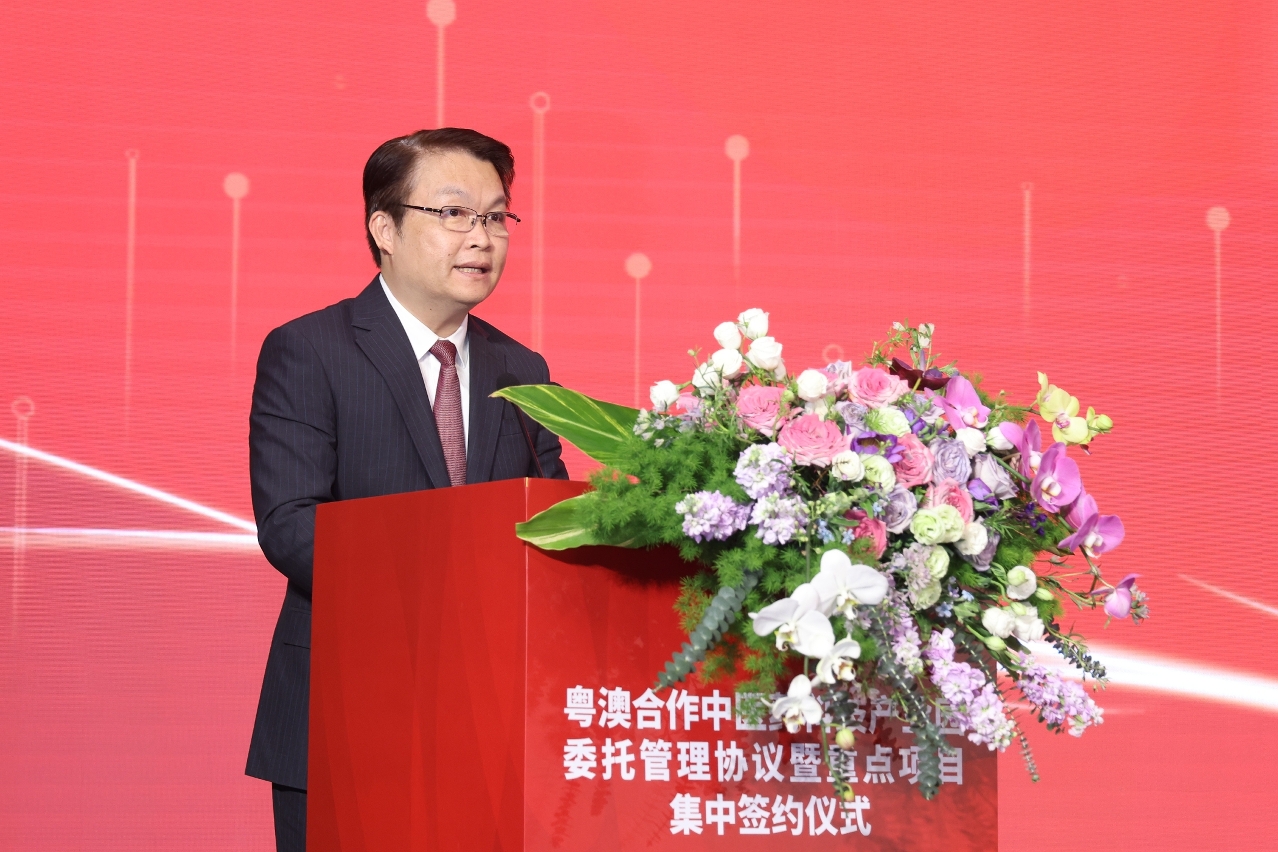 在澳门特别行政区行政长官、横琴粤澳深度合作区管理委员会主任贺一诚,中央人民政府驻澳门特别行政区联络办公室主任郑新聪,中国太平保险集团董事长王思东,澳门特别行政区经济财政司司长、横琴粤澳深度合作区执行委员会主任李伟农和中国太平保险集团副总经理李可东见证下,由澳门投资发展股份有限公司主席吴建峰与太平资本保险资产管理有限公司总经理吴松代表双方签署《粤澳合作中医药科技产业园委托管理协议》,正式建立委托管理关系,共同推进产业园提升服务品质,加快产业聚集。国家中医药管理局局长余艶红,副局长兼中国中医科学院院长黄璐琦,广东省政府横琴办主任、横琴粤澳深度合作区执行委员会副主任聂新平,中国银行业务管理总监赵蓉,中国工程院院士、中医证候全国重点实验室主任刘良教授等出席签约仪式。