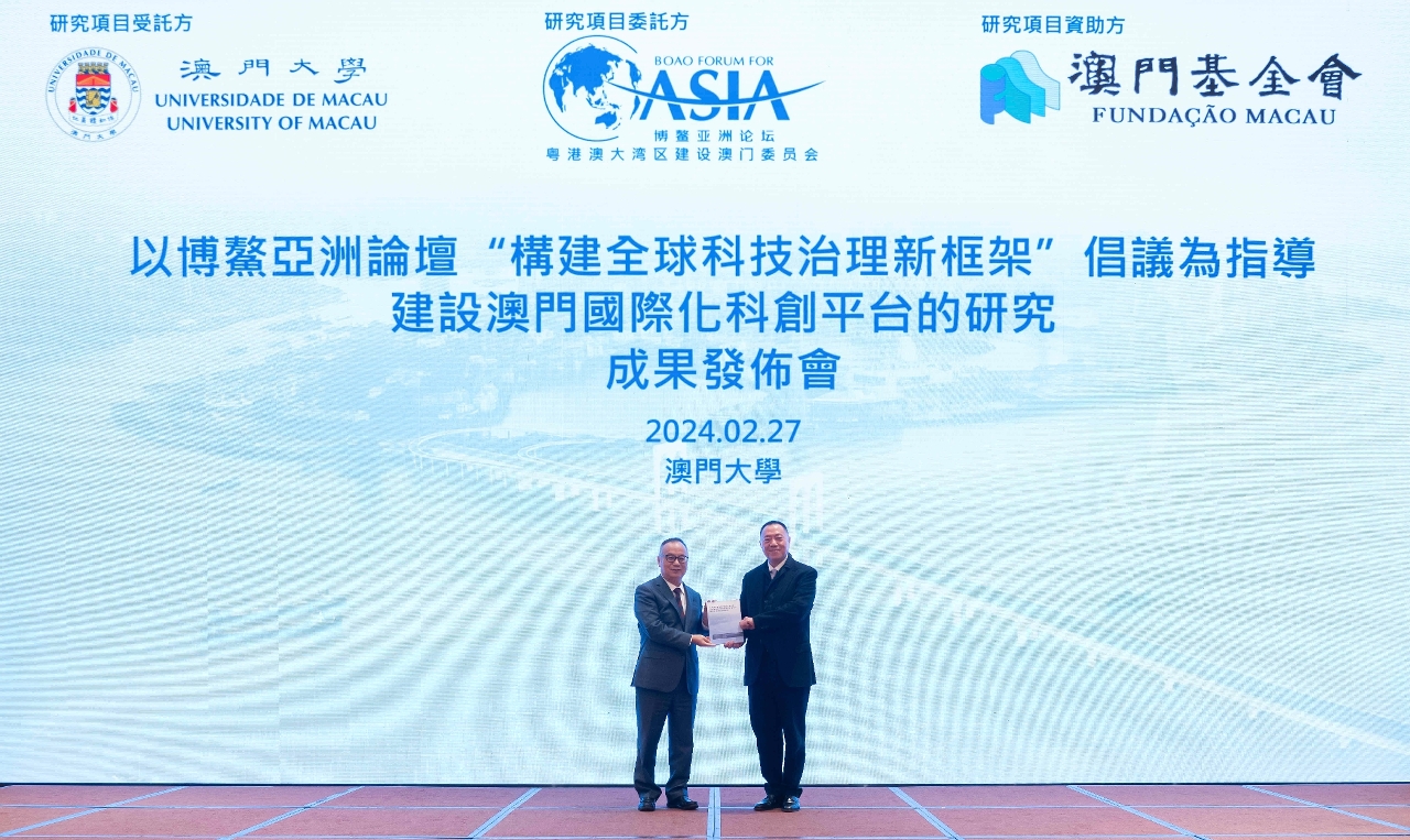 “以博鳌亚洲论坛‘构建全球科技治理新框架’倡议为指导建设澳门国际化科创平台的研究”成果发布会今(27)日在澳大举行。该研究项目受博鳌亚洲论坛粤港澳大湾区建设澳门委员会委托,在澳门基金会的资助下,由澳大研究团队完成,并获博鳌亚洲论坛研究院高度评价。