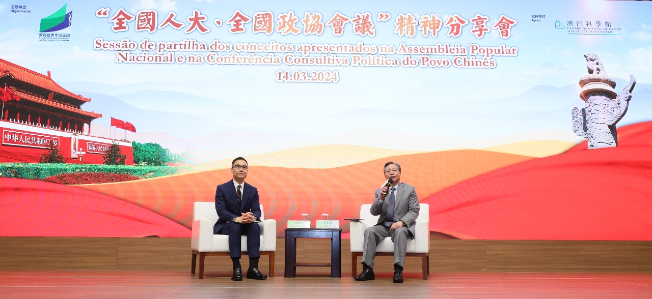 为鼓励青年关心时事,准确认识国家的重大政策及澳门发展的方向,教育及青年发展局于2024年3月14日在澳门科学馆会议中心举行“全国人大、全国政协会议”精神分享会。活动邀请了全国人大常委、澳门特别行政区立法会主席高开贤先生及全国政协常委、澳门特别行政区立法会议员何润生先生担任主讲嘉宾,向青年社团及学校师生介绍本年“人大”和“政协”的会议情况及国家发展的重点政策。分享会现场共吸引了超过300名高校及中学学校代表、团体代表及青年学生参加,同步设线上直播。