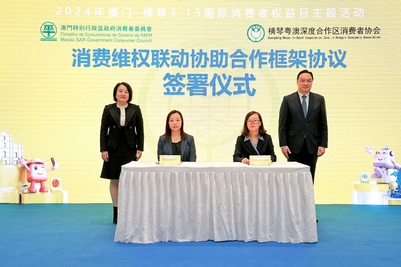 澳门特别行政区政府消费者委员会(下称澳门消委会)与横琴粤澳深度合作区消费者协会(下称深合区消协)联合举办主题活动,响应“3.15国际消费者权益日”。活动上并签署《琴澳消费维权联动协助合作框架协议》(下称《协议》)深化澳琴消费维权协作。