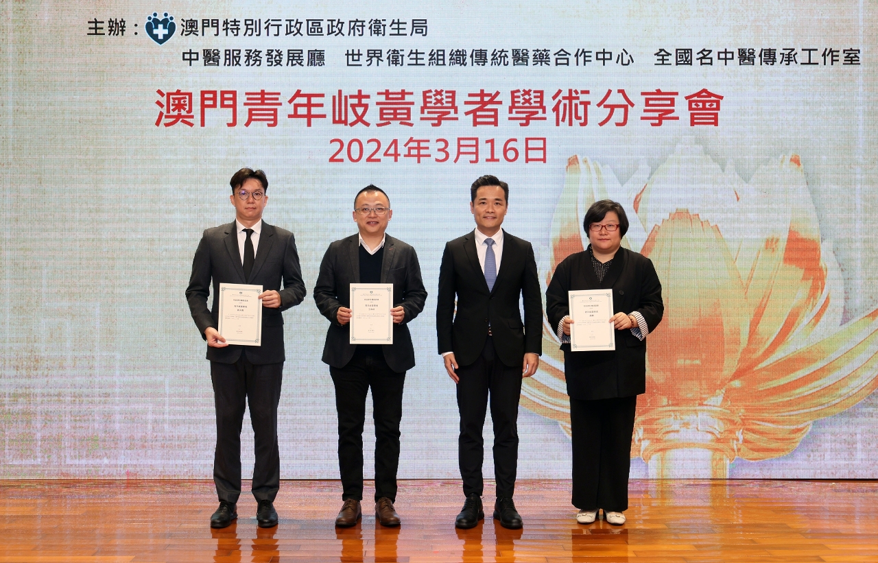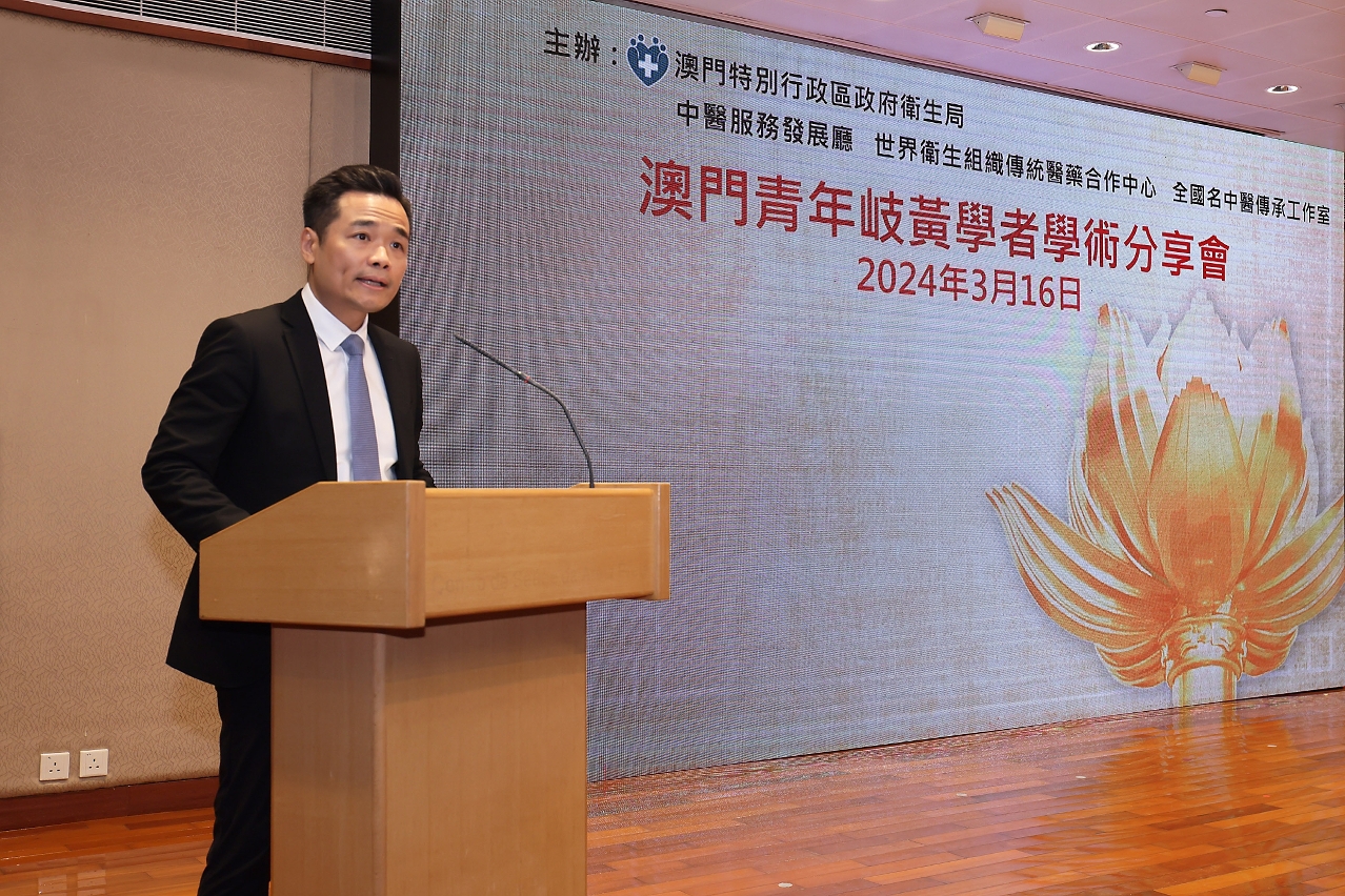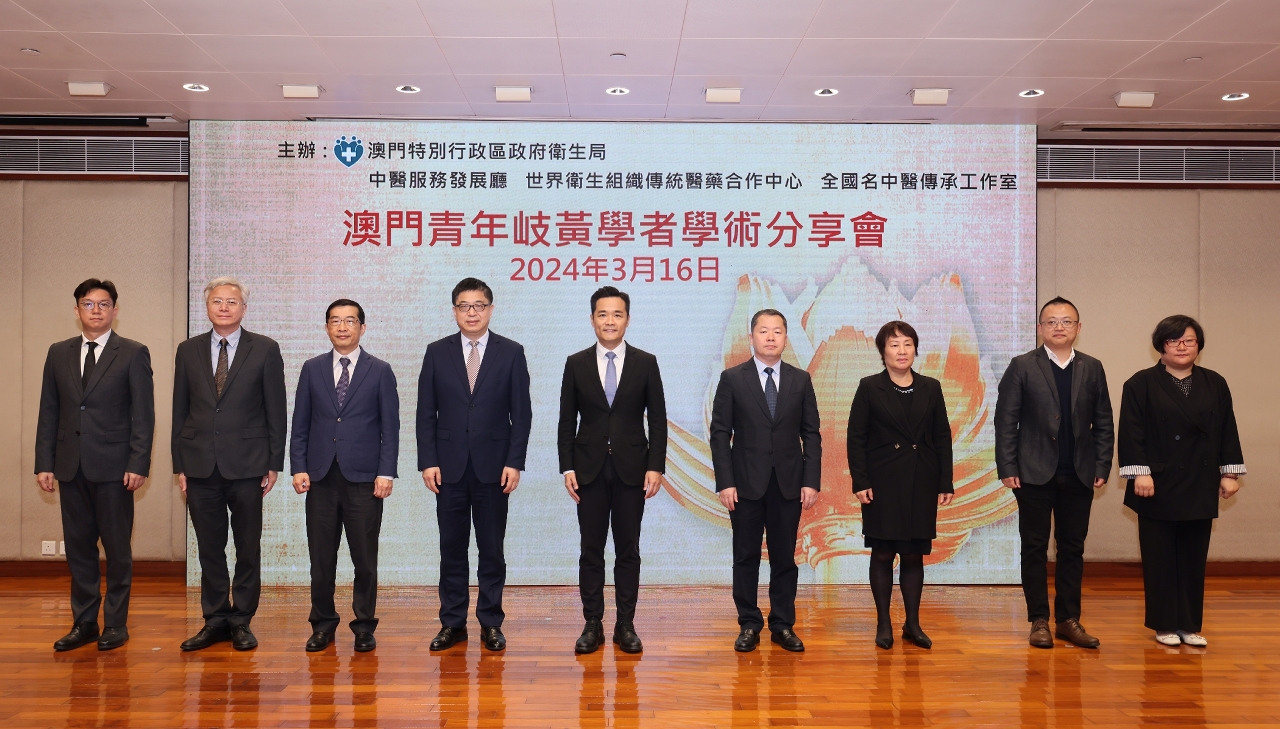 日前卫生局中医服务发展厅、世界卫生组织传统医药合作中心(澳门)及全国名中医传承工作室假黑沙环卫生中心会议厅联合举办“澳门青年岐黄学者学术分享会”,邀请了本澳3位青年岐黄学者就中医药临床思路、中医药科研方法及中医药大健康产业等与业界进行交流和经验分享。中央人民政府驻澳门特别行政区联络办公室宣传文化部万速成部长和卫生局罗奕龙局长出席了会议。