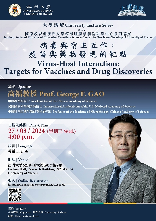 澳门大学将于3月27日(星期三)举办“大学讲坛暨国家教育部澳门大学精准肿瘤学前沿科学中心系列讲座”,邀请中国科学院院士、美国国家科学院外籍院士、中国科学院微生物研究所研究员高福以“病毒与宿主互作:疫苗与药物发现的靶点”为题发表演说,深入探讨研究病毒与宿主的互作机制、研发疫苗及抗病毒药物来防控大流行疾病的重要。欢迎有兴趣人士报名参加。