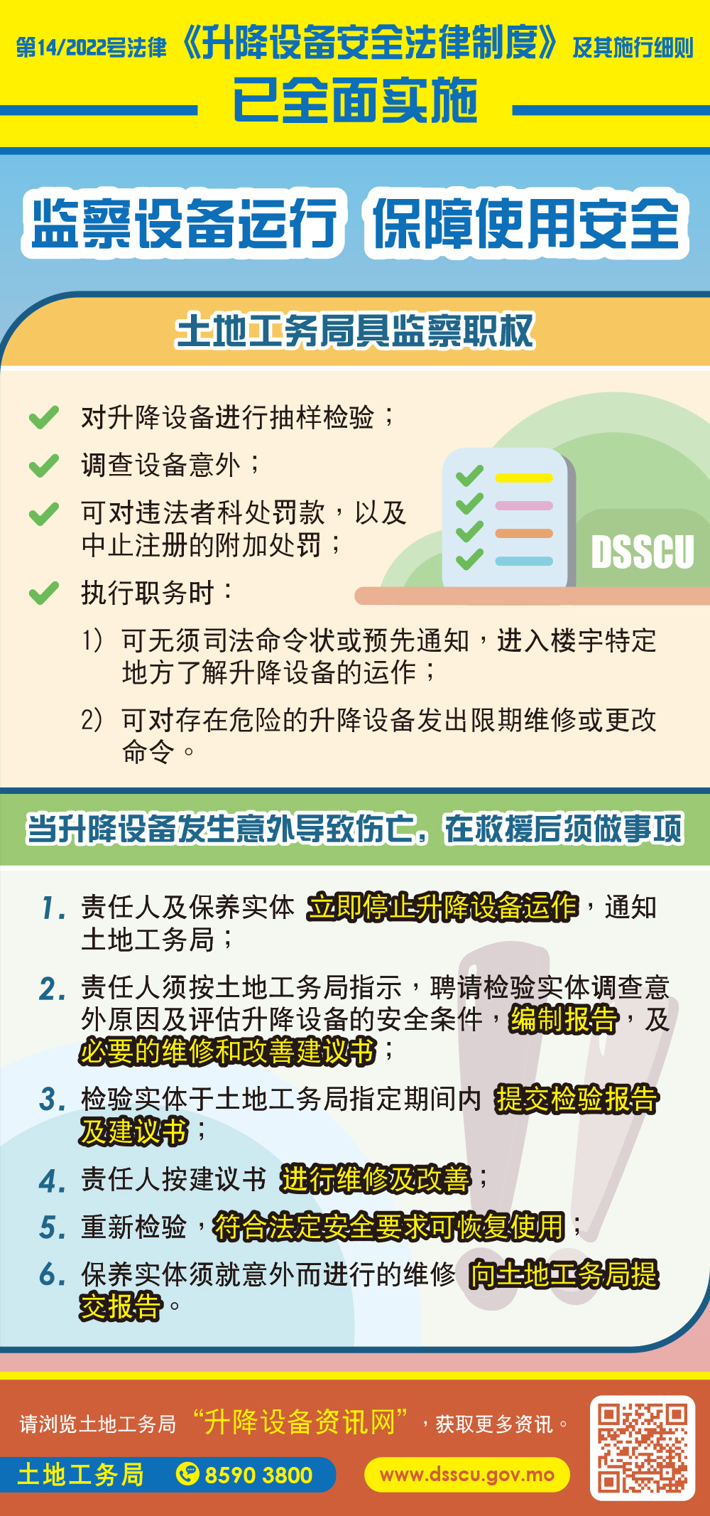 欲了解更多详情,请浏览 “升降设备资讯网” https://www.dsscu.gov.mo/ascensores/zh/,或致电工务局服务中心(85903800)。