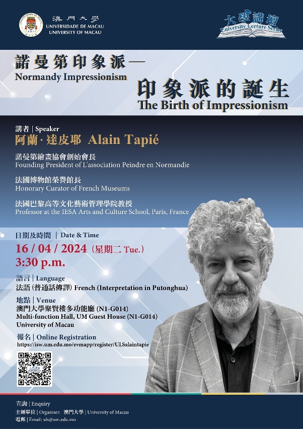 澳门大学将于4月16日(星期二)举办大学讲坛之“诺曼第印象派——印象派的诞生”讲座,邀请法国诺曼第绘画协会创始会长兼法国博物馆荣誉馆长阿兰.达皮耶主讲。欢迎有兴趣人士参加。