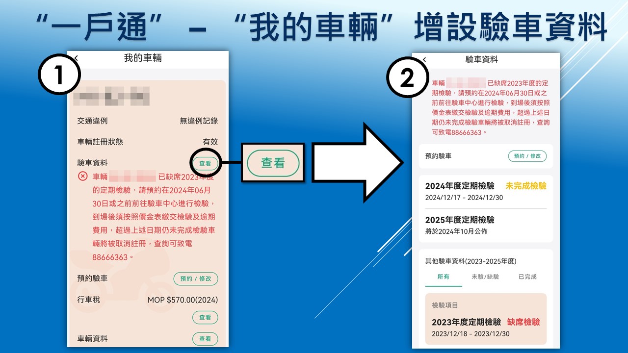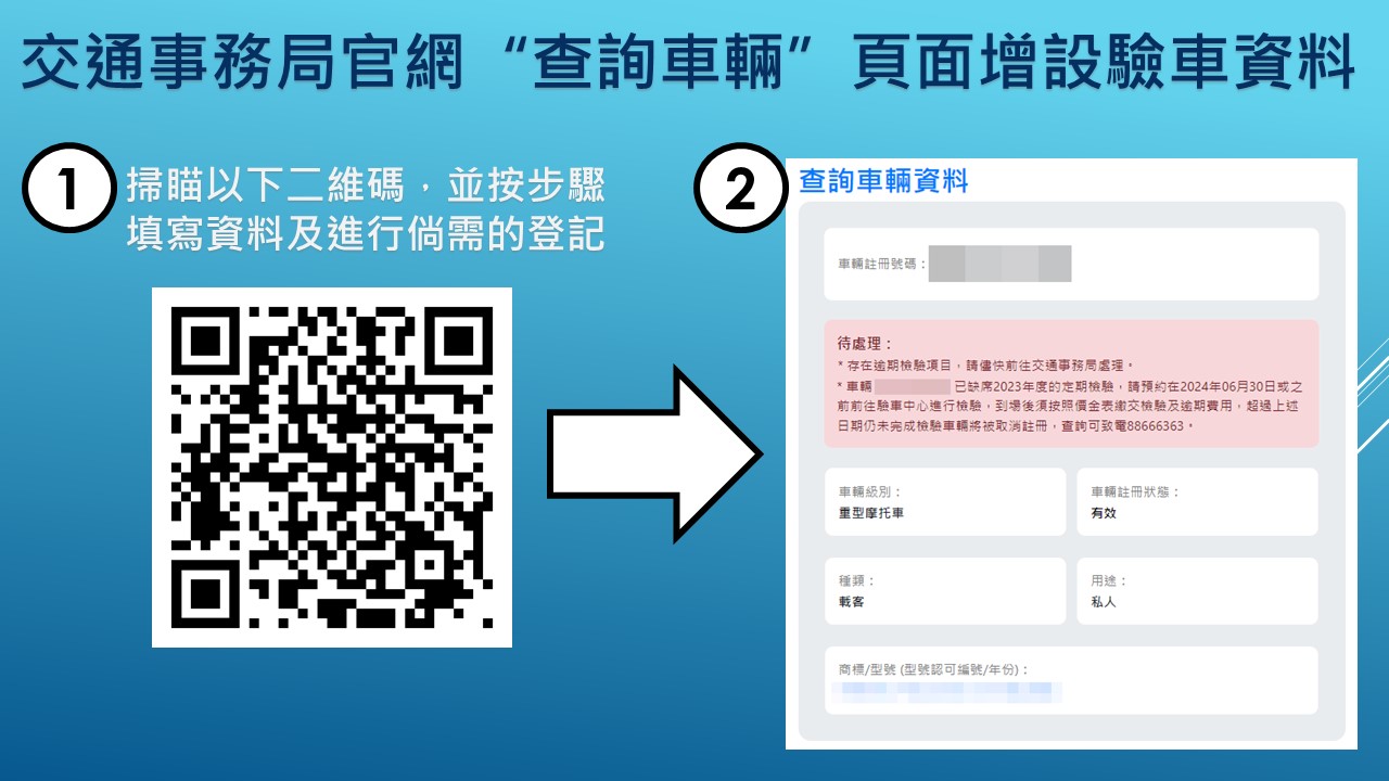 另外,局方亦分别在“一户通”的“我的车辆”页面及在当局官网的“查询车辆资料”系统中加入“验车资料”内容,便捷市民查询验车情况。