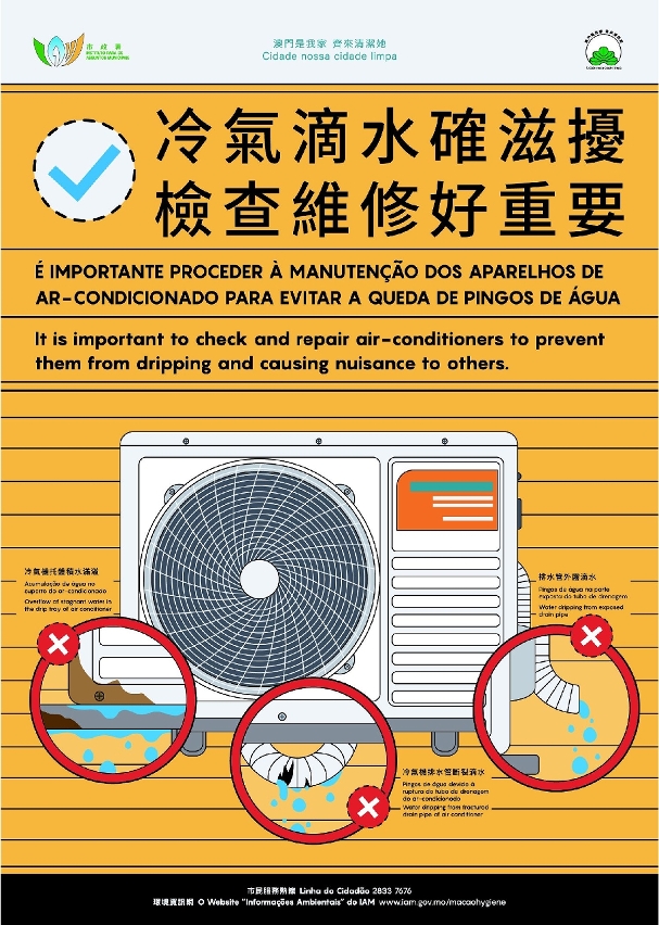 不少市民使用冷气机时,可能会忽略检查冷气机的排水喉管是否已经妥善接驳,从而衍生滴水问题,冷气机水滴落檐篷的声音不但滋扰他人,所造成的积水亦有机会孳生蚊虫,影响公共卫生。市政署呼吁市民在使用冷气机前,应先检查排水喉管有否妥善接驳或出现断裂、底盘有否满溢或渗漏等情况,如有滴水问题应尽快改善或邀请专业冷气技师进行维修。