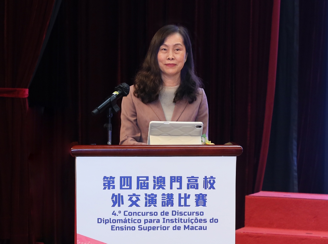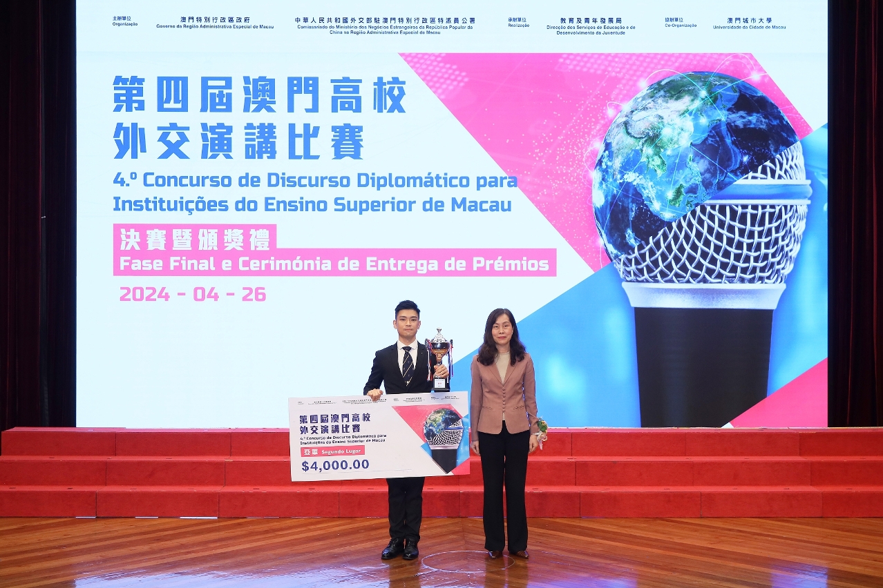 由澳门特别行政区政府、中华人民共和国外交部驻澳门特别行政区特派员公署主办,教育及青年发展局承办、澳门城市大学协办的第四届澳门高校外交演讲比赛决赛于4月26日在澳门城市大学举行。出席嘉宾包括外交部驻澳门特别行政区特派员公署特派员刘显法、社会文化司司长欧阳瑜、中央人民政府驻澳门特别行政区联络办公室教育与青年工作部副部长李勇先、中国人民解放军驻澳门部队政治工作部副主任刘陈长大校、教青局局长龚志明、副局长丁少雄、阮佩贤、黄嘉祺、以及各高等院校领导。