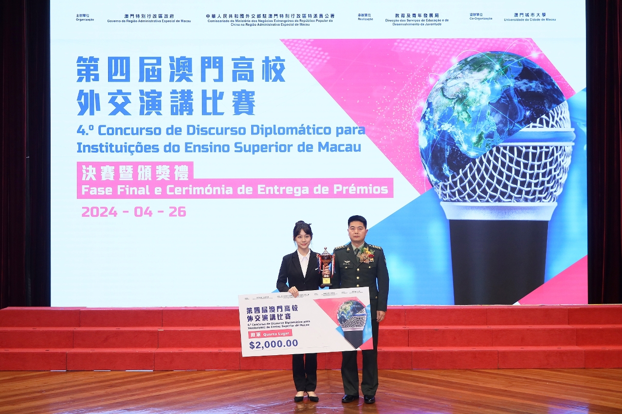 由澳门特别行政区政府、中华人民共和国外交部驻澳门特别行政区特派员公署主办,教育及青年发展局承办、澳门城市大学协办的第四届澳门高校外交演讲比赛决赛于4月26日在澳门城市大学举行。出席嘉宾包括外交部驻澳门特别行政区特派员公署特派员刘显法、社会文化司司长欧阳瑜、中央人民政府驻澳门特别行政区联络办公室教育与青年工作部副部长李勇先、中国人民解放军驻澳门部队政治工作部副主任刘陈长大校、教青局局长龚志明、副局长丁少雄、阮佩贤、黄嘉祺、以及各高等院校领导。