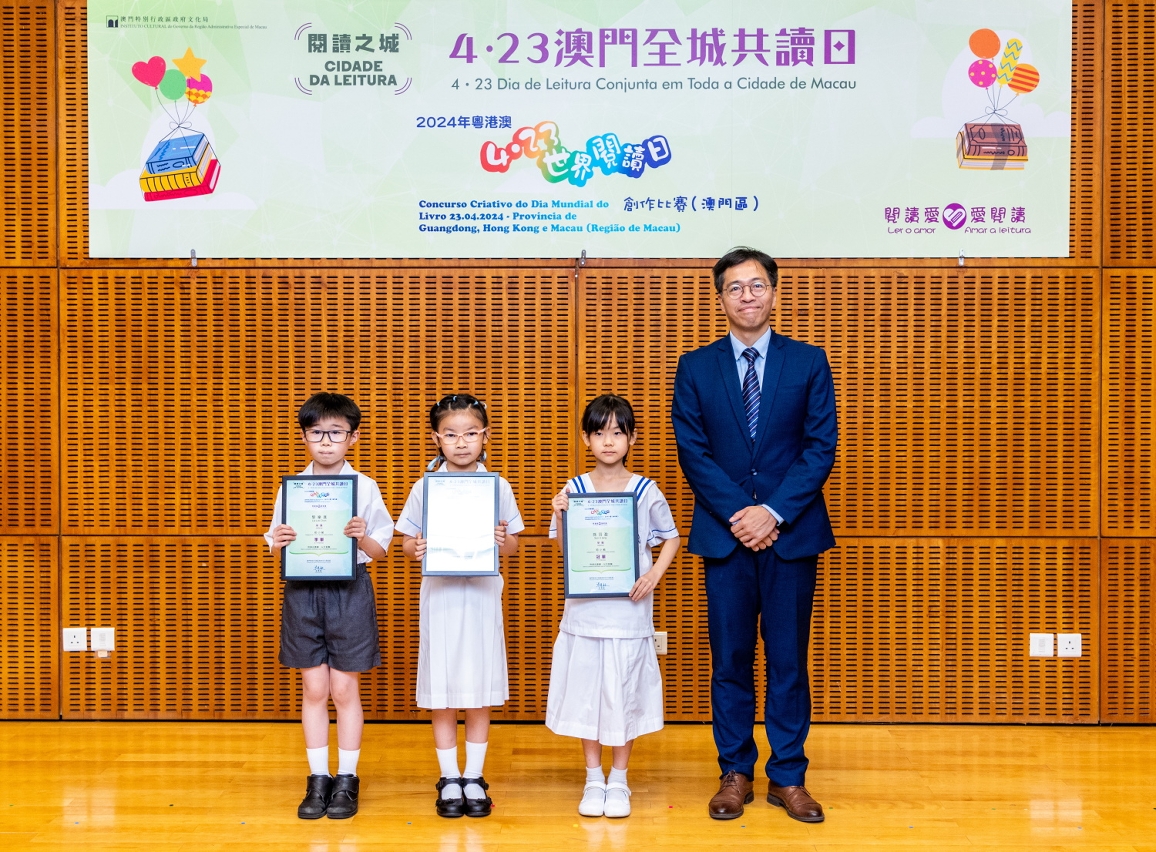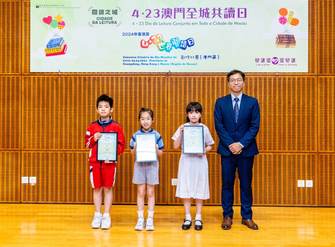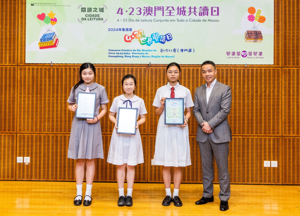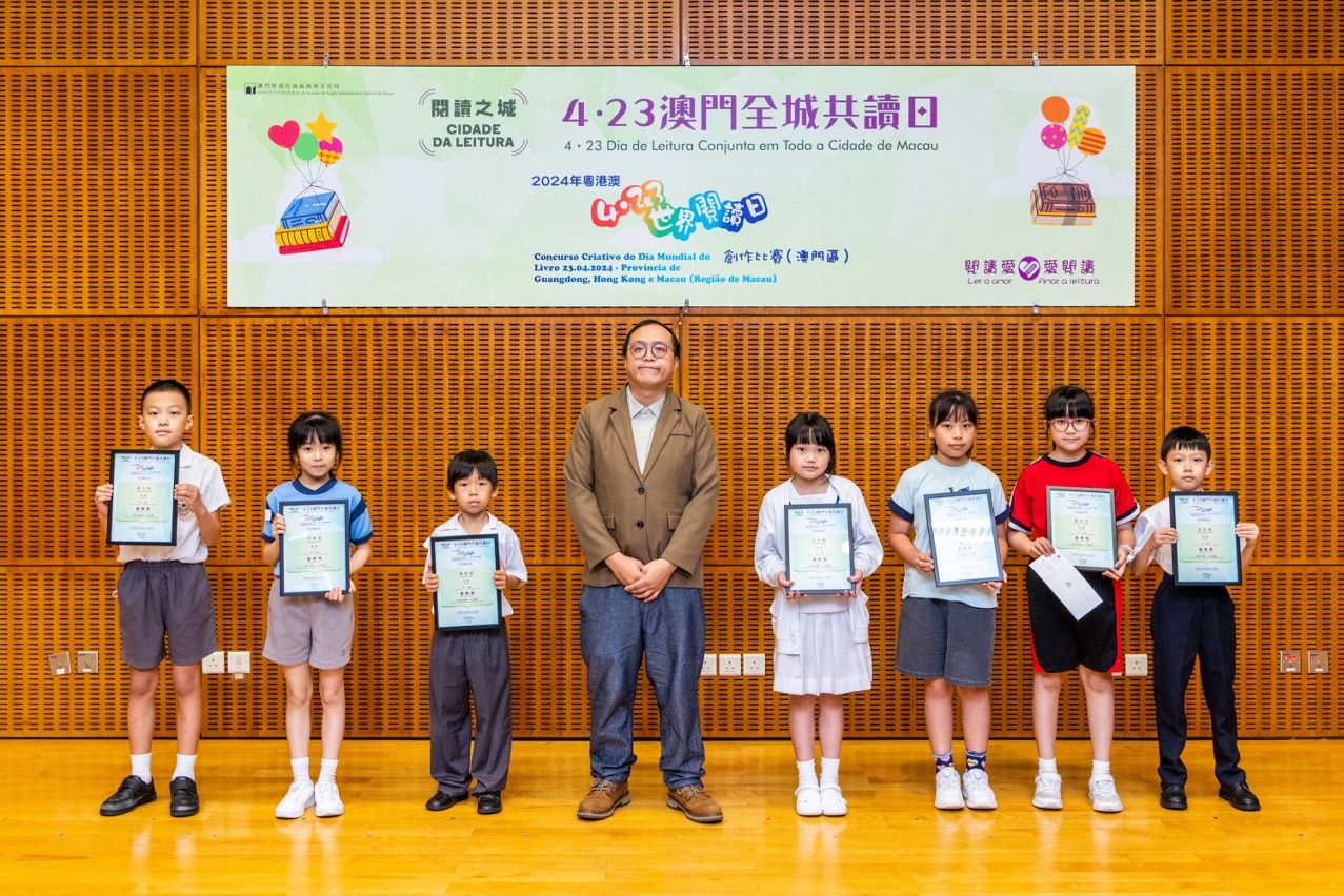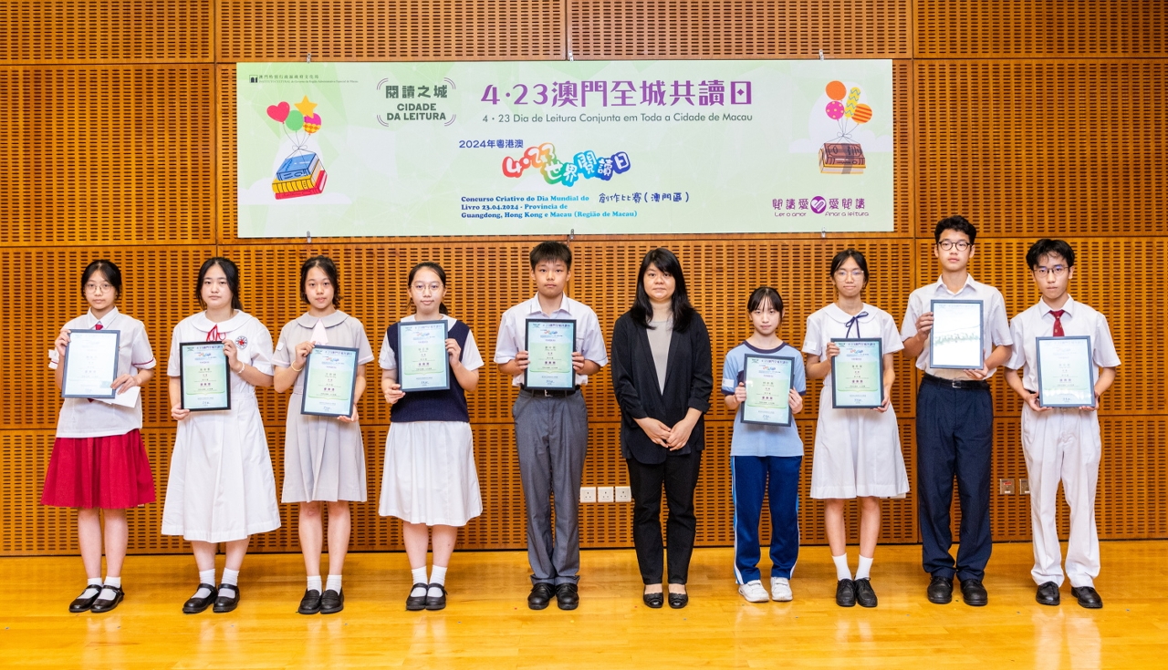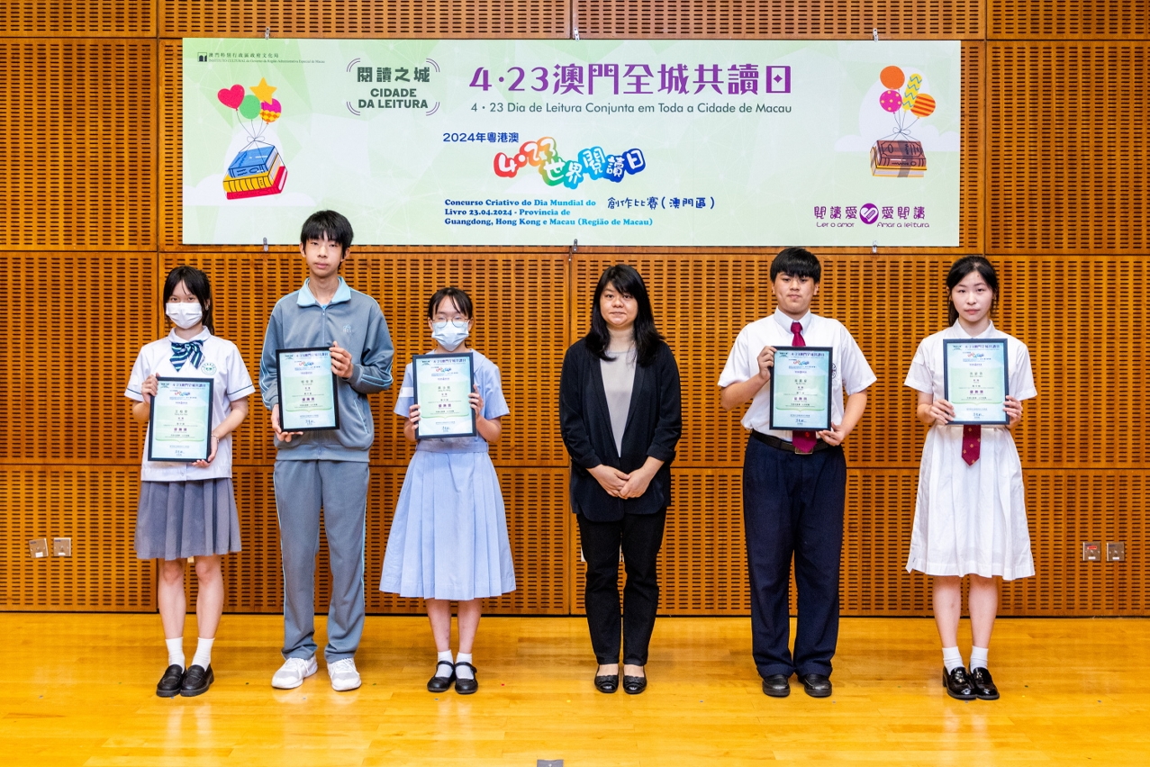 文化局联同广州、深圳及香港等城市之公共图书馆合作举办粤港澳“4‧23世界阅读日创作比赛”,澳门区颁奖礼于4月27日(星期六)在澳门艺术博物馆演讲厅举行,向得奬者颁发奬状及向各得奖者学校致送纪念座,并于现场展出得奖作品,气氛热烈。