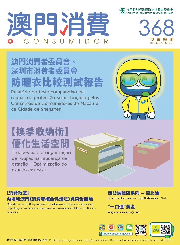 第368期《澳门消费》刊登澳深两地30款防晒衣的比较测试报告,以及对比内地与澳门《消费者权益保护法》的异同。