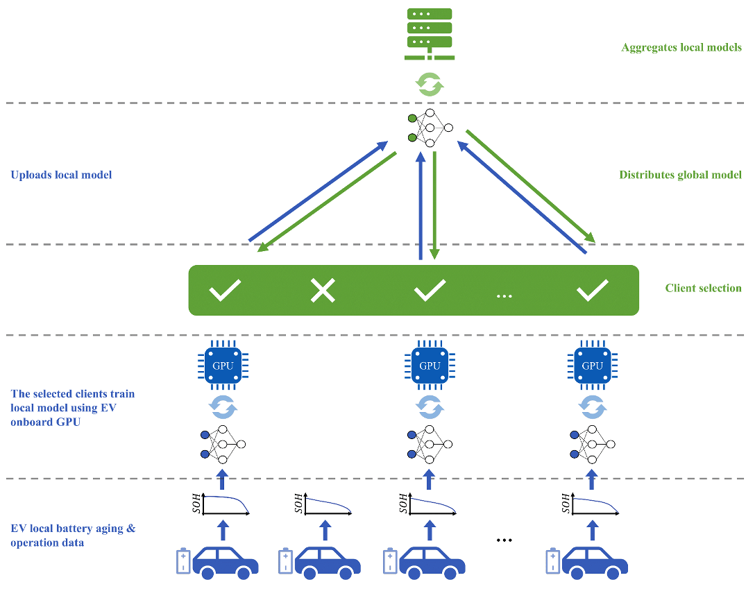 准确预测电池健康状态对电动车的可靠性和行驶安全至关重要。常见的基于深度学习的电池健康预测方法通常依赖集中式数据来训练和改进预测模型。然而,集中式方法存在数据隐私和可扩展性等方面的挑战。本研究提出了一种基于联邦学习的分散式模型训练方法,能够在保障驾驶者隐私、有效利用车载计算资源、并快速整合新数据的情况下,准确预测电池的衰退。针对电动车应用场景,本研究还提出了一种应用于联邦学习训练的客户端选取策略,这一策略能够在分散式训练中提高模型的准确性,并达到与集中式训练相近的效果。