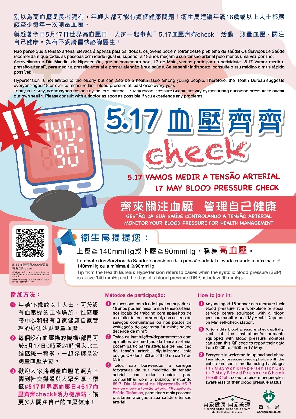 卫生局秉持“预防优先,妥善医疗”的理念,透过制定健康政策、创设健康环境和促进个人健康行为,以达致构建健康澳门的目标。为唤起居民关注血压问题、加强主动管理自己健康,尤其提升年轻族群对测量血压的关注度,并配合“世界高血压日”于5月17日举办“5.17血压齐齐check”活动,具体如下: