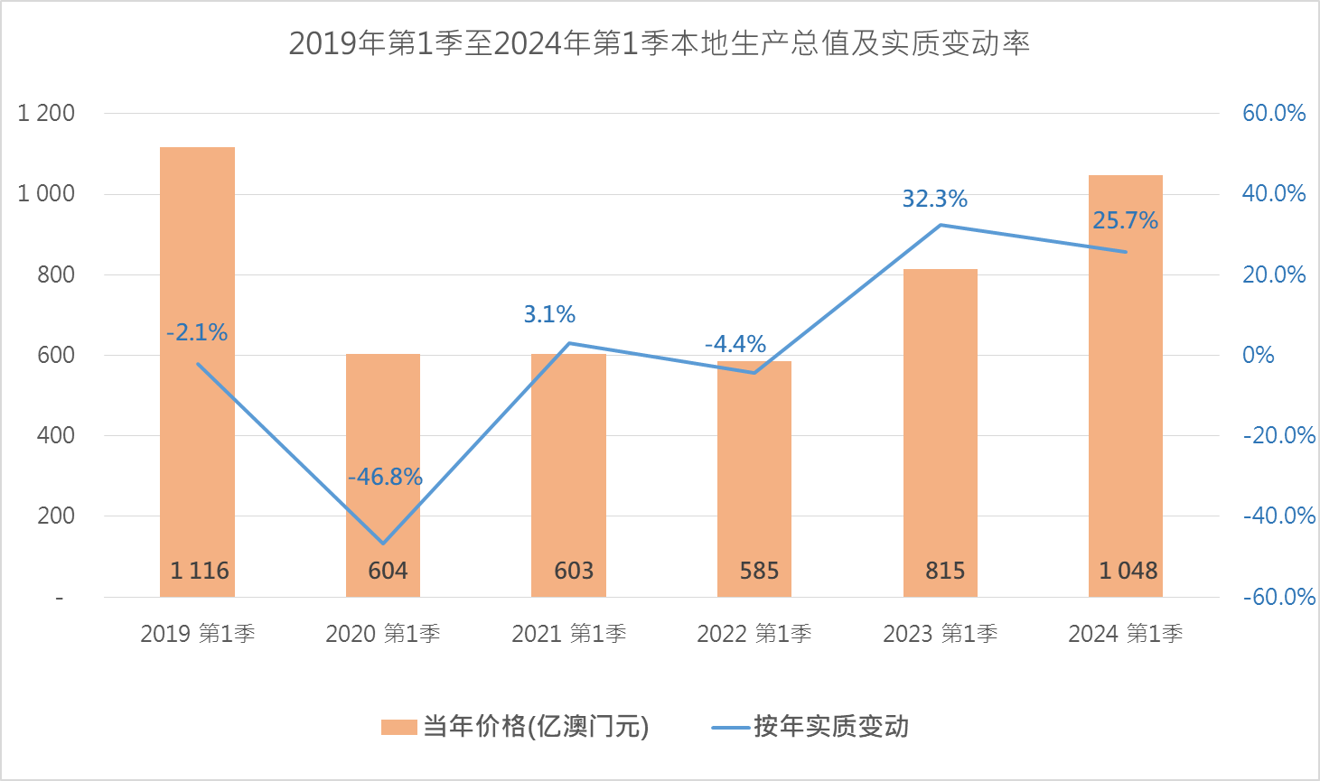 统计暨普查局资料显示,受惠服务出口保持增长,加上私人消费及固定资本形成总额持续回稳,本澳经济得到进一步复苏,2024年第1季本地生产总值录得实质增长25.7%,整体经济规模已回复至2019年同期的87.2%,当中博彩服务出口及其他旅游服务出口按年分别上升62.7%及14.8%,内部需求(包括私人消费支出、政府最终消费支出及投资)亦录得3.4%的增幅;量度整体价格变动的本地生产总值内含平减物价指数(106.8)上升2.3%。
