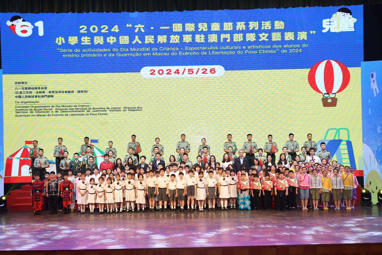 为了庆祝六月一日国际儿童节,让本澳小学生感受节日气氛的同时,亦能加强与中国人民解放军驻澳门部队的互动交流,提升小学生的民族意识,弘扬爱国爱澳精神,由教育及青年发展局、社会工作局、法务局、体育局组成的“六.一国际儿童节组织委员会”和中国人民解放军驻澳门部队合办的2024年“六.一国际儿童节系列活动——小学生与中国人民解放军驻澳门部队文艺表演”已于5月26日上午假氹仔军营顺利举行。