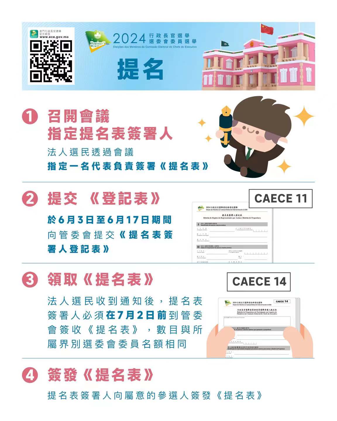 管委会提醒法人选民,选派提名表签署人时,必须确认有关人士为已登记的自然人选民(被登载于今年1月展示的选民登记册内的人士),否则,将不获发给提名表。同时,法律规定每一名自然人选民只能作为一个法人选民的提名表签署人。