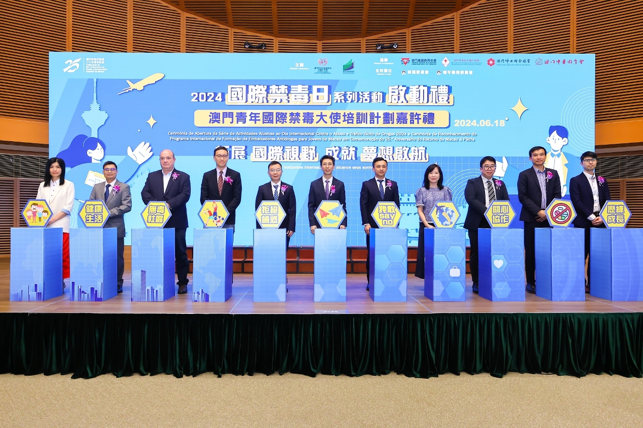 由社会工作局、教育及青年发展局合办,澳门基督教青年会、澳门中华学生联合总会、澳门妇女联合总会、澳门中华教育会协办的“庆祝澳门回归祖国25周年之2024国际禁毒日系列活动启动礼暨澳门青年国际禁毒大使培训计划嘉许礼”,于6月18日下午4时假澳门科学馆会议中心会议厅举行。启动仪式由社会工作局韩卫局长、中央人民政府驻澳门特别行政区联络办公室社会工作部赵河清副部长、教育及青年发展局黄嘉祺副局长、香港特区政府保安局禁毒处李基舜禁毒专员、澳门基督教青年会关淑铃总干事、澳门戒毒康复协会Augusto P.V. Nogueira主席、鲍思高青年服务网络行政总监及关注青少年毒品问题工作小组召集人叶永强先生、澳门基督教新生命团契刘展瑞总干事、圣公会澳门社会服务处叶鉴波服务总监、澳门工会联合总会区子扬医疗服务总监,以及禁毒法执行及跟进工作小组召集人谭国辉先生主持,禁毒委员会、青年事务委员会、政府部门、学校、防治滥药协作机构共超过200人出席活动,活动同步设有线上直播。