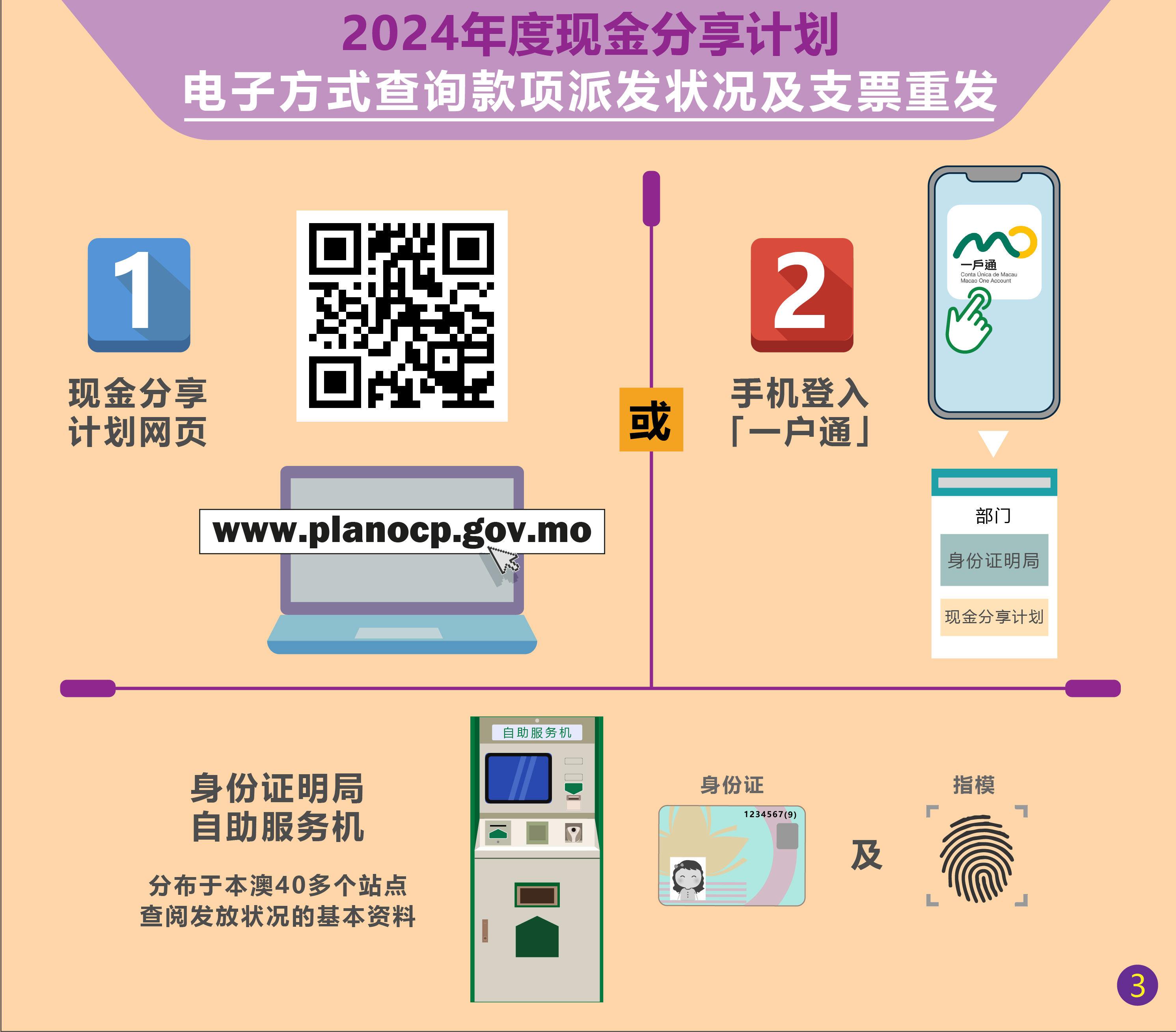为方便居民查询收取现金分享款项的状况,居民可连结《现金分享计划》专页(www.planocp.gov.mo)或登入一户通查询个人发放资料,或未能符合法律规定《现金分享计划》发放条件的原因。亦可使用身份证明局分布于本澳40多个站点的自助服务机,以身份证及指模验证后,即时得知发放状况的基本资料。
