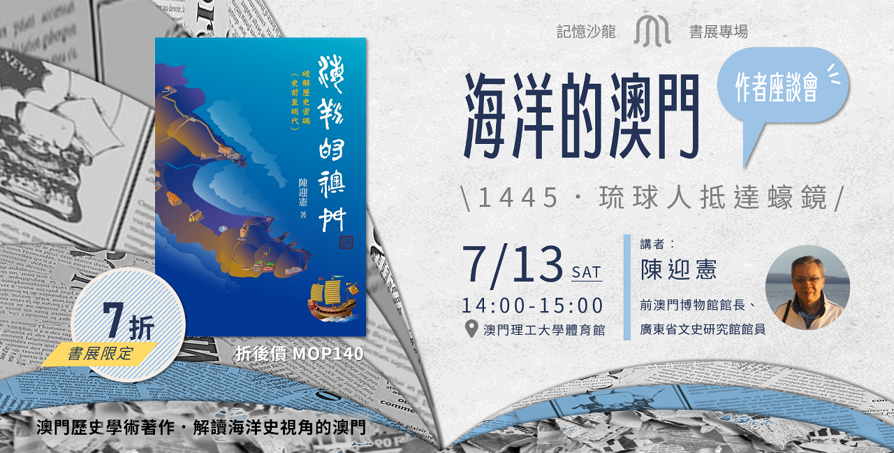 《海洋的澳门──破解历史密码(史前至明代)》由澳门基金会联合三联书店(香港)有限公司合作出版,作者是前澳门博物馆馆长、广东省文史研究馆馆员陈迎宪先生。作者通过中外历史文献考证,发现最早来到澳门的并非葡萄牙人,而是:1445年就抵达蚝镜的琉球人。该发现涉及中琉关系史、天妃信仰传入、澳门首条国际航线、东亚地区航线和贸易网络等课题,并将澳门近代史前推了122年至明朝上叶。本次“记忆沙龙”特别场讲座,讲者将就如何破解澳门史上的诸多密码,及众说纷纭的说法,提供最新的澳门史资讯。讲座于7月13日(星期六)下午2:00-3:00 于澳门理工大学体育馆举行,名额有限,先到先得,欢迎市民踊跃参与,查询可电邮至MacauMemory@fm.org.mo。
