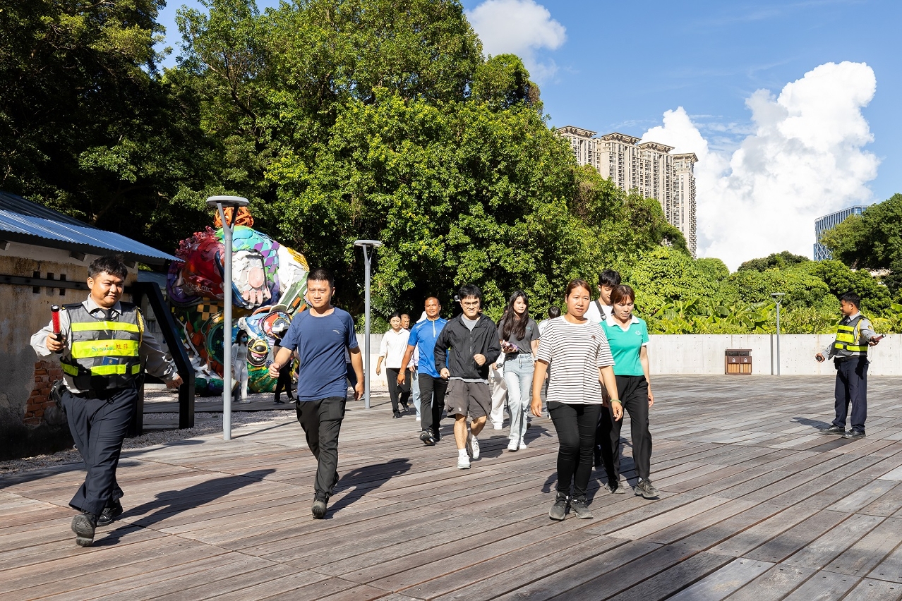 文化局自2020年起重点针对景点场所的消防安全、危机事故的应对处理,建立访客游览安全机制,持续为前线管理人员安排培训活动及组织火警演习。培训当日,消防局代表就氹仔益隆炮竹厂旧址的场地特性、日常用电安全的注意事项、发生紧急事故时的应变措施及逃生技巧,以及就《楼宇及场地防火安全的法律制度》等逐一进行讲解,并介绍不同类型消防设备的使用。及后,一众工作人员就地进行消防疏散演习,模拟旧址内发生小型火警,前线管理者发现后迅速采取一系列应变措施,包括检查场地、寻找火源、疏散人群、通报消防局、使用灭火筒、为到场消防员作必要配合等,演习过程顺利并达到预期成效。是次演练有助进一步优化景点处理紧急事故时的协调机制,提升管理人员及保安人员的危机应变及沟通协调能力。