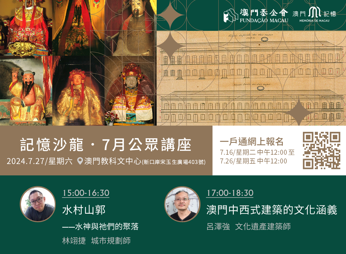 日前于“第二十七届澳门书市嘉年华”举办的“记忆沙龙”书展特别场,由陈迎宪先生主讲的“海洋的澳门:1445・琉球人抵达蚝镜”座无虚席、气氛热络。接续,本会将在7月27日(星期六)下午于澳门教科文中心推出两场“记忆沙龙”(公开场),分别由城市规划师林翊捷主讲的“水村山郭——水神与祂们的聚落”和文化遗产建筑师吕泽强主讲的“澳门中西式建筑的文化涵义”。