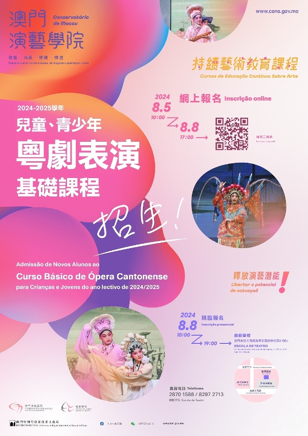 为培育本地粤剧艺术传承人才,让更多儿童、青少年投身学习粤剧表演,2024/2025学年“儿童、青少年粤剧表演基础课程”将招“基础一级平喉”及“基础一级子喉”学员,对象为年龄9至13岁的澳门居民,名额有限,有意者可于8月5日(星期一)上午10时至8月8日(星期四)下午5时,登入网页www5.icm.gov.mo/consreg/cmt 进行网上报名,或于8月8日(星期四)上午10时至晚上7时亲临澳门演艺学院戏剧学校(澳门友谊大马路海景花园新安花园87号U)报名,详情可浏览澳门演艺学院网页(www.cons.gov.mo)或于办公时间致电2870 1588查询。