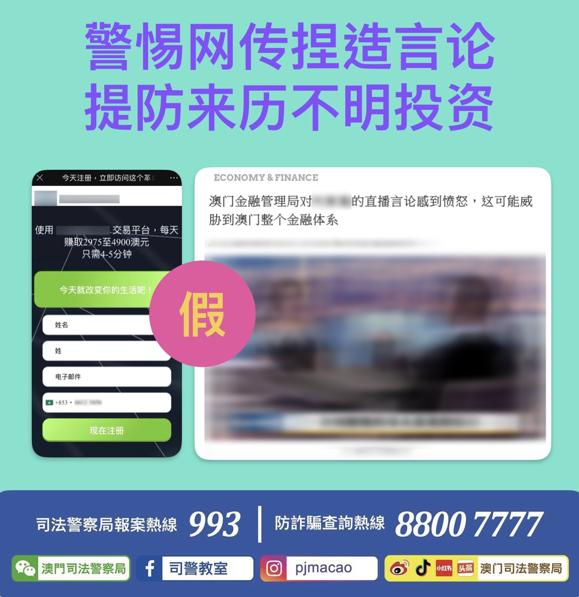 3. 倘有怀疑,可使用司警局“反诈程式"查核风险指数,或致电防诈骗查询热线88007777或报案热线993求助。