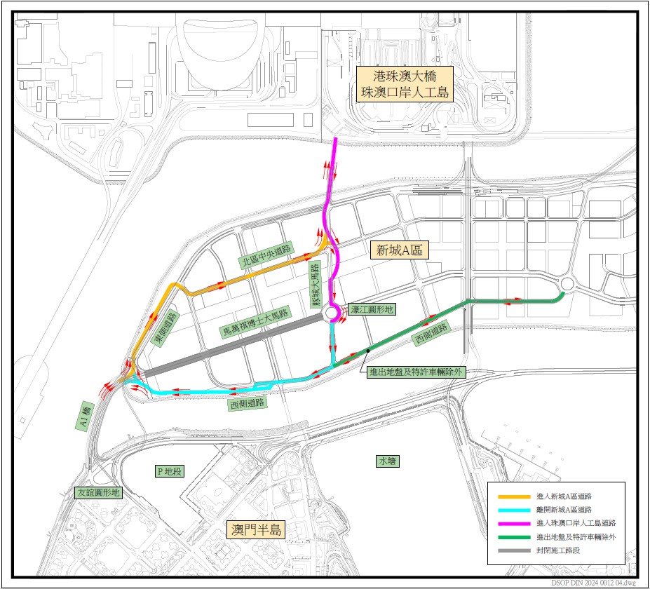 新城A区东侧道路将于2024年8月25日开通,届时由澳门半岛进入港珠澳大桥珠澳口岸人工岛的车辆需使用东侧道路,而目前用作进入港珠澳大桥珠澳口岸人工岛及新城A区的马万祺博士大马路施工期间将全面封闭(详见附图),是次的交通通行措施主要是配合新城A区的规划及发展,同时为下一阶段在马万祺博士大马路进行共同管道及道路施工创造条件,请驾驶者留意现场交通指示及改道后的行车路线。
