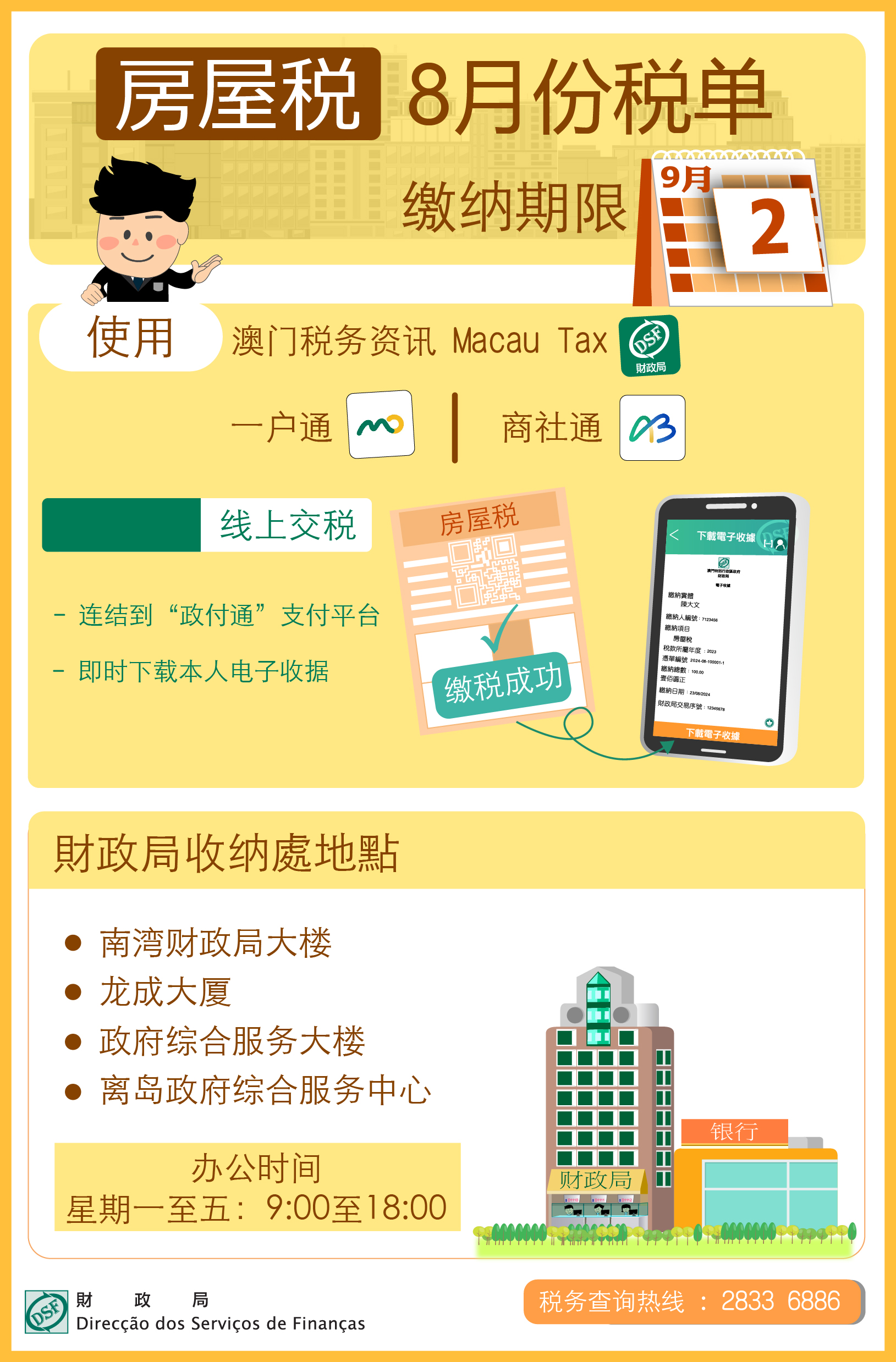 财政局提醒房屋税纳税人,2023年度房屋税征税凭单上缴纳月份属8月的房屋税,缴纳期限至9月2日届满,仍未缴纳上述房屋税的纳税人应尽快缴纳,避免因逾期缴纳而须附加过期利息和罚款。