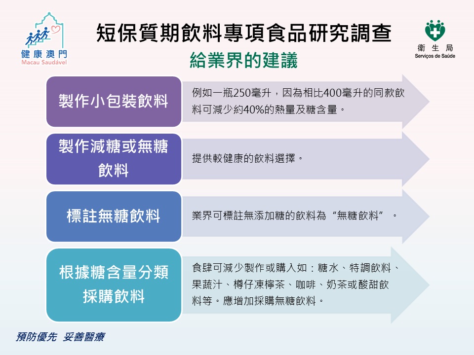 市政署与卫生局完成“澳门生产短保质期饮料专项食品研究调查”,抽取了100个在本地生产且保质期为数天的饮料进行食品安全及营养成分检测,整体食品安全及卫生的合格率达百分之九十九,反映市售澳门生产短保质期饮料大致符合食用安全及卫生要求。惟24个样本属高糖饮料,当中4个超出世卫建议每日糖分摄取量,建议消费者宜选择小包装及无糖饮料更健康。