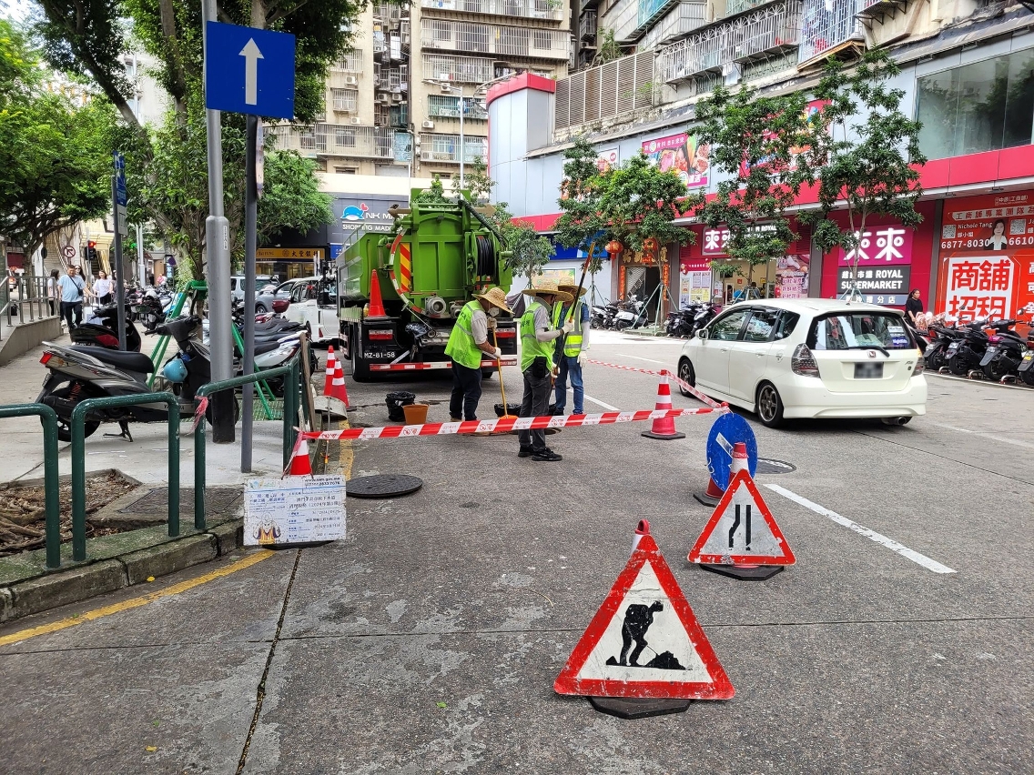 市政署持续派员检查各区下水道和雨水井,保障公共渠网的排洪能力,并调派人手及泵车加强渠道疏导工作;今年1至8月完成清理下道约15.7万米、清理雨水井逾2万多次。近期已疏通关闸广场、黑沙环区、筷子基区、内港区及氹仔旧城区等一带的渠道,重点加强疏通积水易发地点。另外,市政署亦已于暑假完成关闸广场、黑沙环工业街等地的渠道分流,及在美副将大马路下游渠道节点工程,改善渠网排水能力。当暴雨讯号及8号风球生效期间,市政署立即启动应变机制,持续监察及保障各项排水设施的运行;外判人员协助巡查各区及紧急疏通工作。