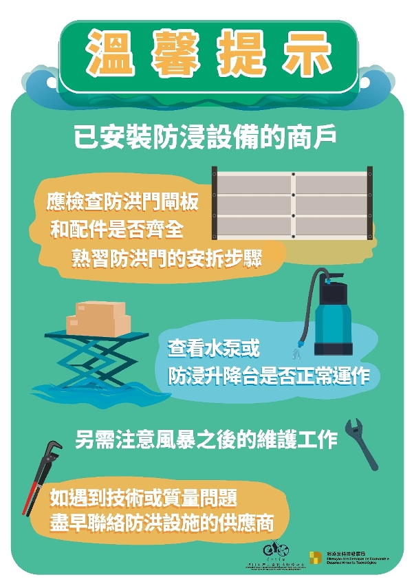 已安装防浸设备的商户,应检查防洪门闸板和配件是否齐全,熟习防洪门的安拆步骤;已安装防浸升降台和水泵的商户,应检查设备是否正常运作。如有疑问,应尽快向所属的工程公司或供应商了解,做好准备,以策万全。