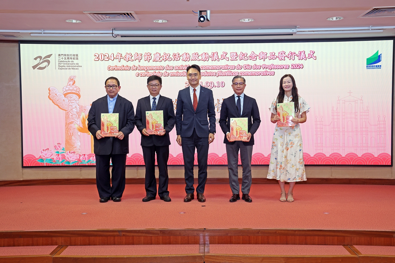 2024年教师节庆祝活动启动仪式暨纪念邮品发行仪式、喜迎双庆教师节海报及漫画作品展开幕礼于9月10日上午举行,教青局局长龚志明、中央人民政府驻澳门特别行政区联络办公室教育与青年工作部副部长李勇先、邮电局行政委员会委员孙君炀、教青局副局长丁少雄、阮佩贤、黄嘉祺、澳门中华教育会理事长郑洪光、澳门高等教育发展促进会会长莫启明、澳门天主教学校联会会长周伯辉、澳门公职教育协会理事长香梅、教育委员会委员、教学人员专业委员会委员、高等院校代表及非高等教育学校代表等出席活动。