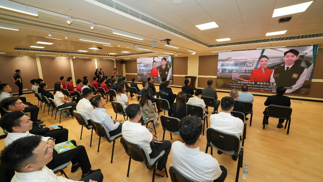 讲座结束后,“时刻做好防盗,旅途安心之道”防罪影片首映仪式随即举行。该影片由司警局及澳门航空股份公司合作摄制,片中展示窃贼的作案手法和预防方法,并由司警局刑事侦查员和澳航空服员作出提防机舱盗窃的呼吁,提醒乘客加强警惕并妥善保管个人财物。仪式结束后,司警局社区警务及公共关系处及侵犯财物罪案调查科人员随即前往澳门国际机场,开展相关防罪宣传,呼吁市民和旅客在乘搭飞机时须提高警觉,减低财物被盗的风险。