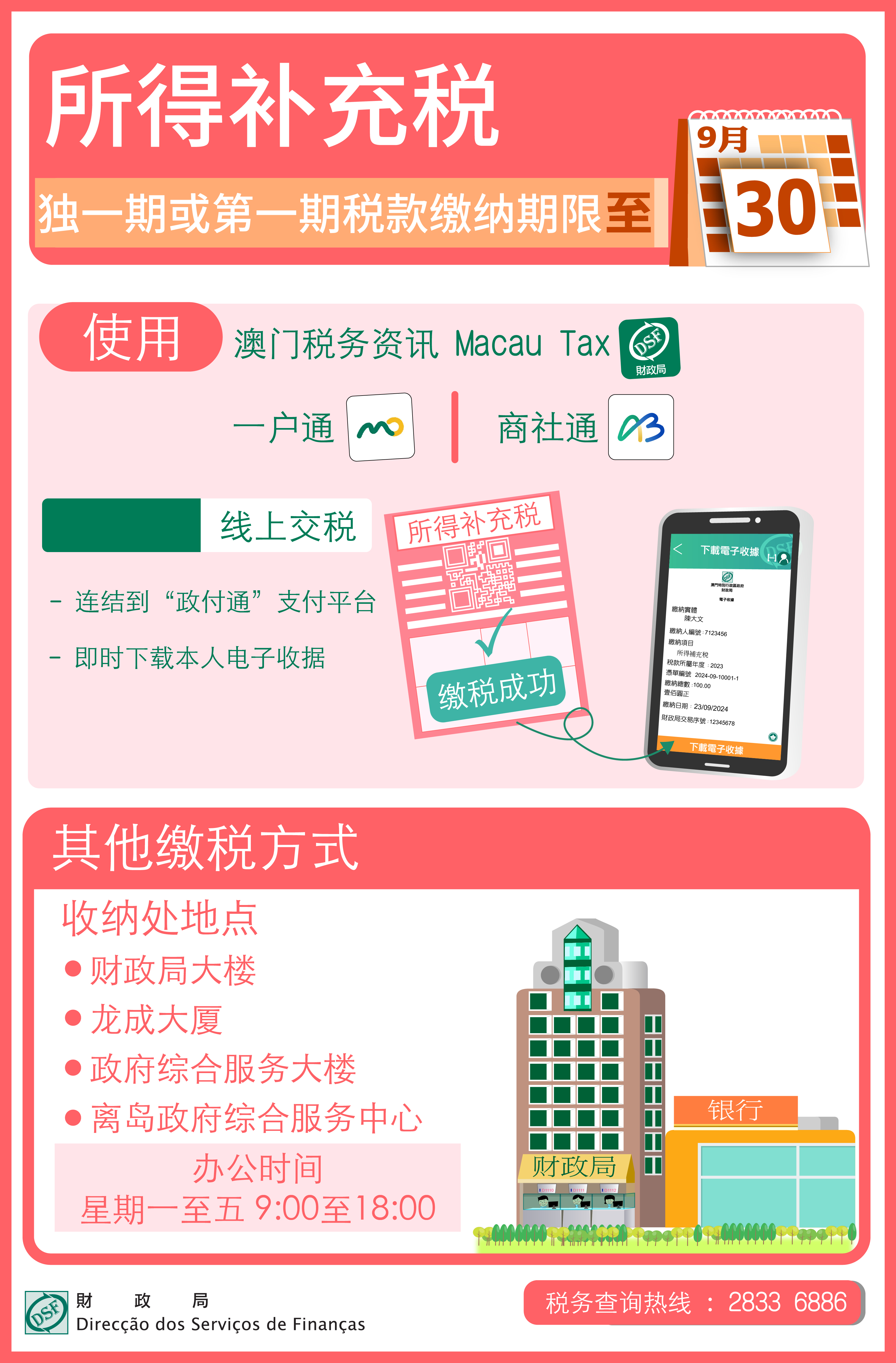 财政局提醒所得补充税纳税人,缴纳月份为9月的独一期或第一期所得补充税,缴纳期限至9月30日止;倘第一期未于法定期内缴纳,将加征过期利息及欠缴税款百分之三,并引致第二期缴纳期立即到期。