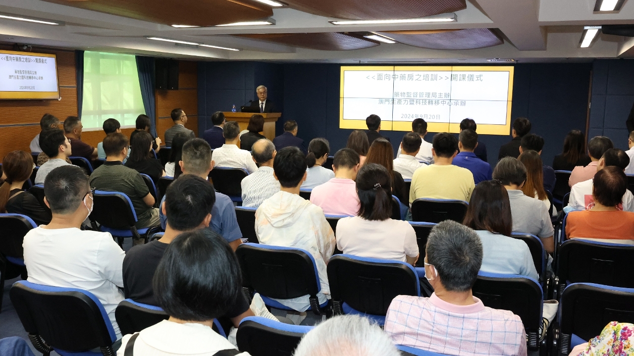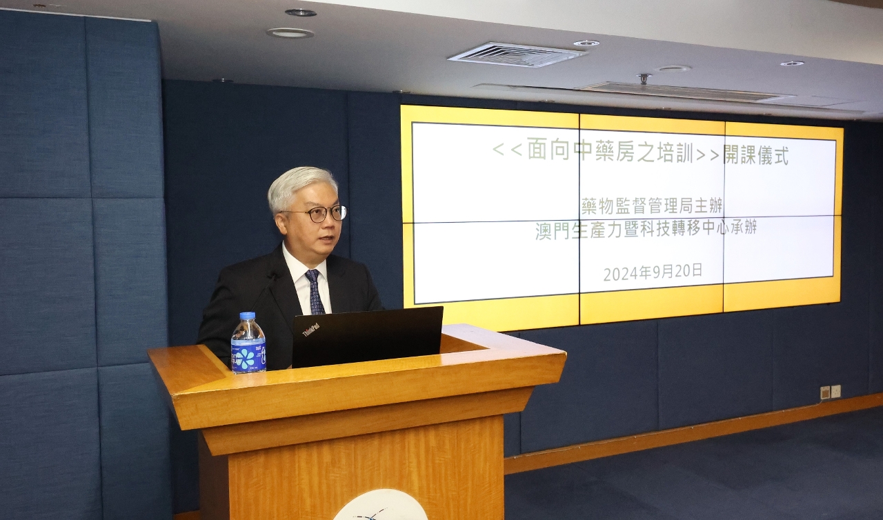 由药物监督管理局主办、澳门生产力暨科技转移中心承办的《面向中药房的培训课程》于本年9月20日及26日举办,今天举行了简单而隆重的开班仪式。