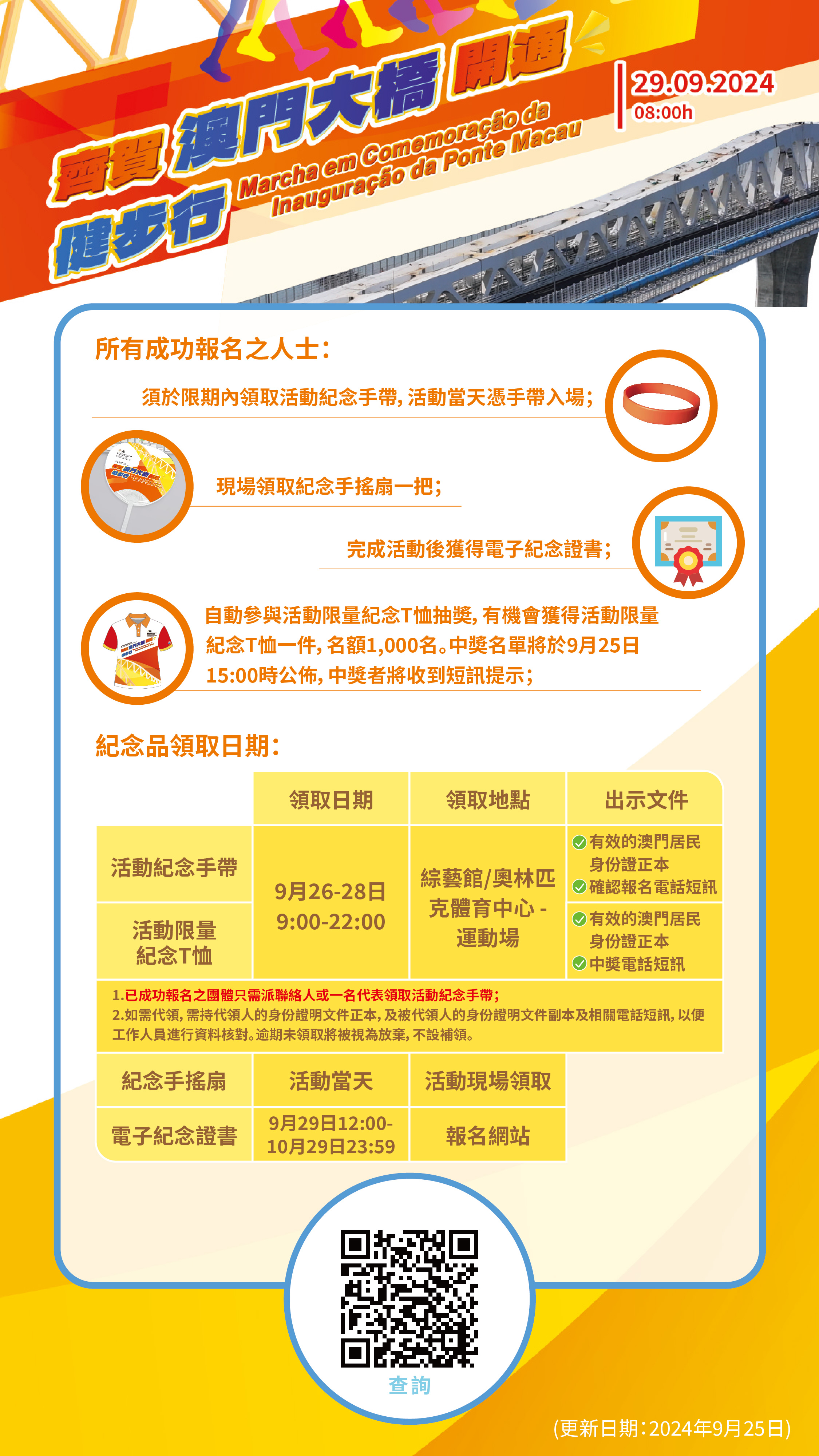 为热烈庆祝中华人民共和国成立75周年及澳门特别行政区成立25周年,由体育局主办的“齐贺澳门大桥开通健步行”将于9月29日举行,活动获市民踊跃参与,报名期已于今(25)日完结。主办单位提醒已成功报名人士,于9月26日至9月28日上午9时至晚上10时到综艺馆及奥林匹克体育中心‒运动场领取活动手带。参加者必须于活动当日佩戴手带方可进场。
