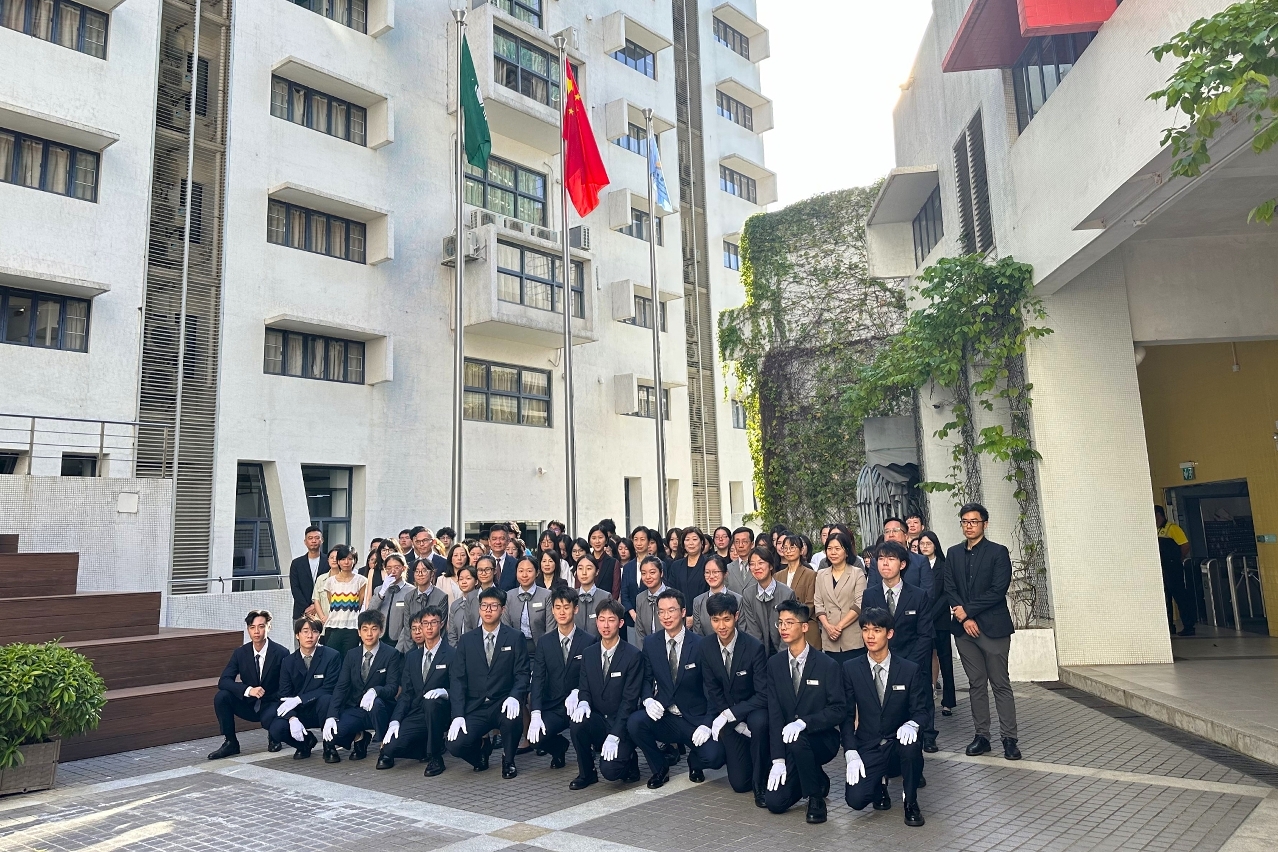 升旗仪式由澳旅大学生国旗仪仗队进行。队伍整齐列队,气氛庄重肃穆。随着国歌奏响,国旗、区旗和校旗缓缓升起,全体师生肃立致敬,面向旗帜行注目礼,以表达深深的敬意。