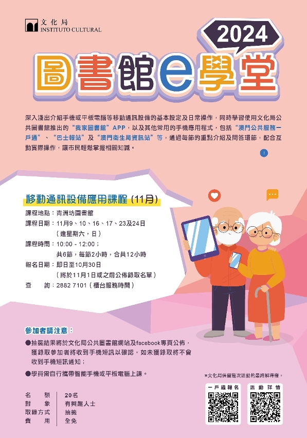活动名额有限,以抽签方式取录,费用全免,参加者需自行携带智能手机或平版电脑上课。有兴趣之市民可即日起至10月30日透过一户通的“活动报名”(activity.mo.gov.mo/activity-h5/activity-list-web)进行网上报名,亦可于柜台服务时间致电2882 7101查询。活动详情可浏览公共图书馆网页(www.library.gov.mo)或“我家图书馆”手机应用程式。