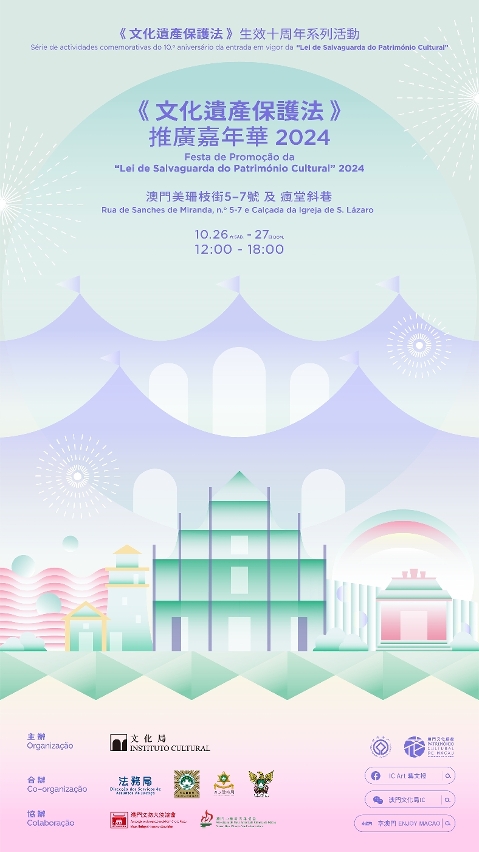 文化局一直致力提高公众对《文化遗产保护法》(下称《文遗法》)及本澳文化遗产的认识,在《文遗法》生效十载之际,文化局将于10月26日及10月27日中午12时至下午6时,在疯堂斜巷及美珊枝街5-7号户外空间举办“《文化遗产保护法》推广嘉年华2024”,向公众普及澳门文化遗产知识与法律内容。活动现场设有摊位游戏及多项丰富活动,免费入场,参加者完成指定数量摊位游戏后可获赠纪念品,欢迎市民到场参与。