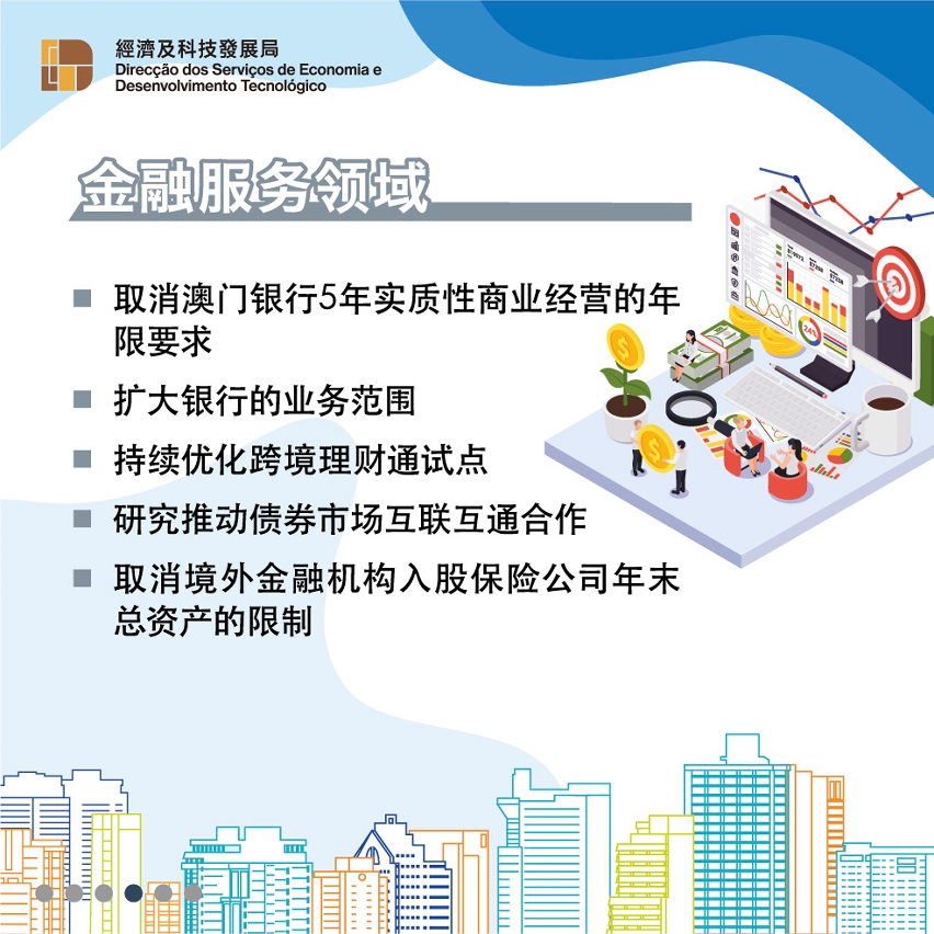 《修订协议二》增加高新科技、金融服务、视听文化等服务领域的开放措施,支持澳门“1+4”适度多元发展策略,为澳门经济适度多元发展创造新空间。科技领域方面,对符合条件的澳门“科技企业认证计划”企业在内地视同与高新技术企业除税收优惠外的同等待遇、允许符合条件的澳门服务提供者在内地获得相关技术资质认可、取消澳门企业在试点地区提供互联网数据中心等业务的股比限制等。金融服务领域方面,取消澳门银行5年实质性商业经营的年限要求及境外金融机构入股保险公司年末总资产的限制等。视听文化领域方面,允许澳门企业投资电影制作、与内地合拍电视剧可视为国产电视剧播出和发行等。