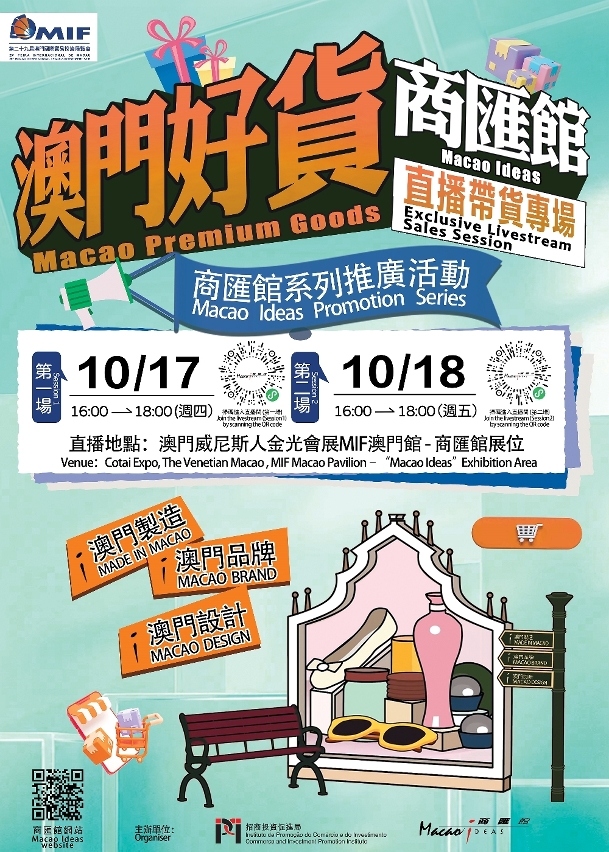 此外,在第29届MIF的第二及第三日(10月17及18日)下午4时至6时将于会场内进行两场“‘澳门好货’商汇馆直播带货专场”,由企业代表及主播以直播互动形式,介绍及展销近20间商汇馆展商、过百款澳门产品,种类丰富,涵盖大健康食品、手信饼食、咖啡茶饮、文创产品、服饰鞋履等,欢迎大众和客商登入线上直播间,选购“澳门好货”。