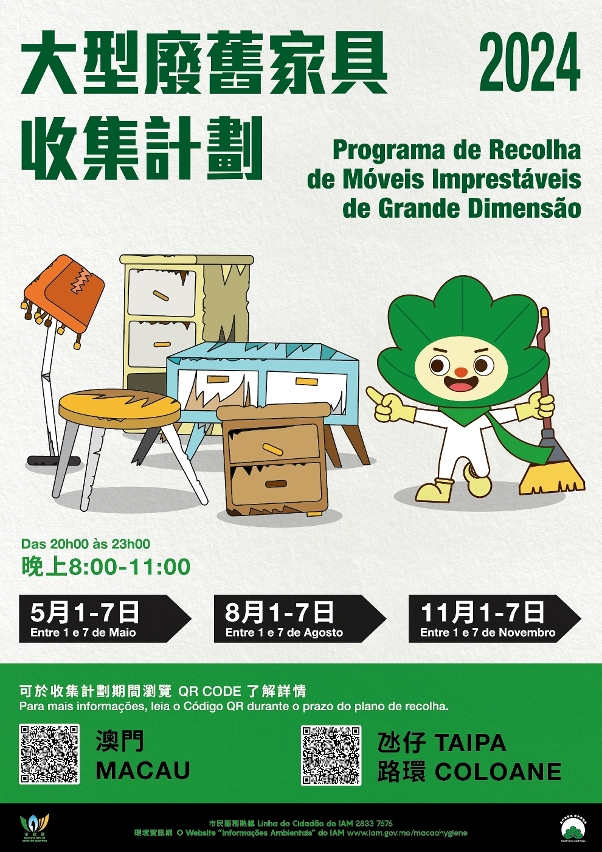为方便市民弃置大型废旧家具,市政署将于十一月一日至七日设置六十个临时大型废旧家具收集站供市民使用。其中,澳门半岛设有五十个收集站,氹仔及路环则分别设有六个和四个。