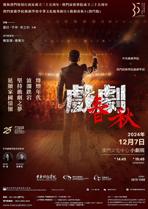 为庆祝澳门特别行政区成立二十五周年及澳门演艺学院成立三十五周年,文化局辖下澳门演艺学院戏剧学校将于12月7日(星期六)下午2时45分和晚上7时45分,在澳门文化中心小剧院演出中华文化优秀剧目《戏剧春秋》。